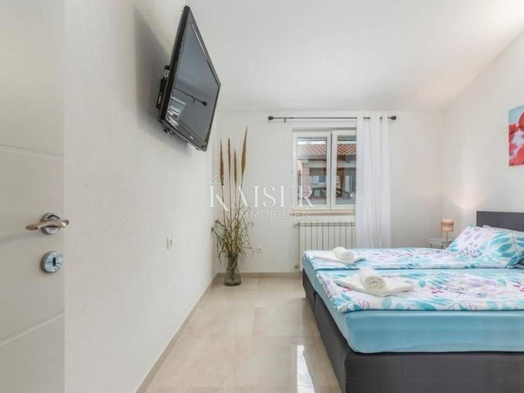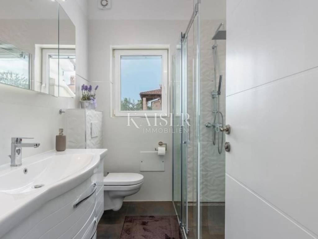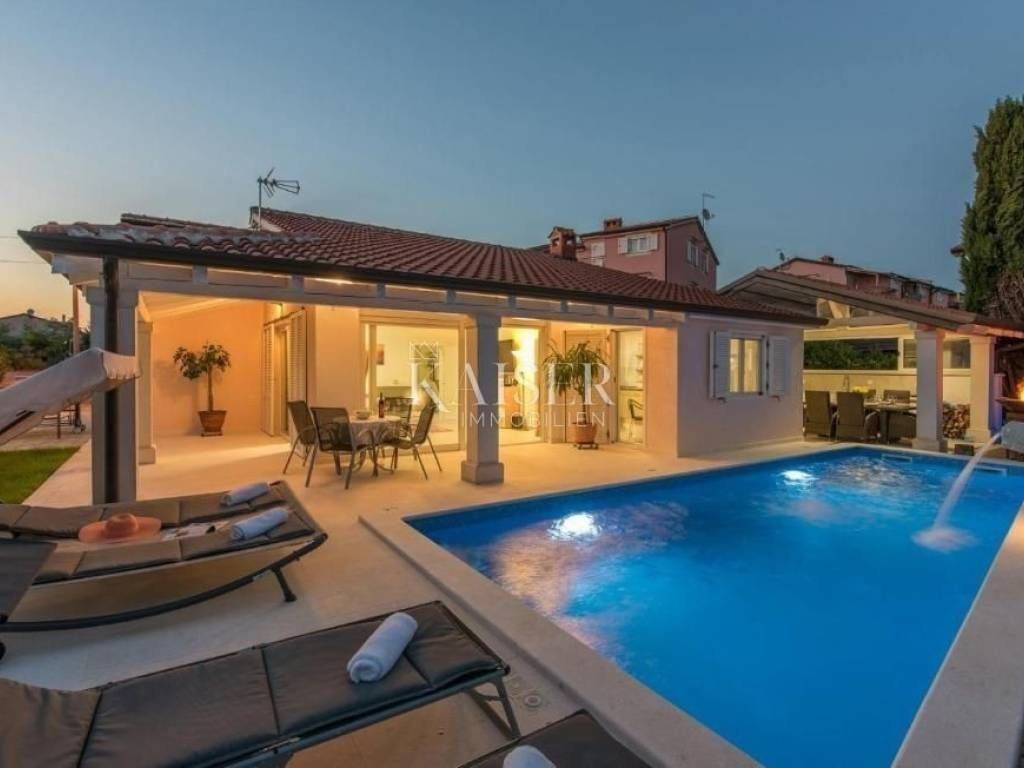Kaiser Immobilien offers for sale a modern single-storey house with a swimming pool near Poreč, perfect for family life or investment. In a popular settlement not far from the city of Poreč, this beautiful house with a swimming pool is located, ideal for those looking for a combination of a peaceful rural environment and proximity to all urban amenities. Surrounded by family houses and holiday homes, it offers the perfect balance between privacy and the practicality of everyday life. The house of timeless design stands out with its simple but elegant exterior architecture. It is a single-storey house of 159 m², consisting of one well-equipped and tastefully decorated residential unit. The internal layout includes: - a spacious living room with a dining room and kitchen, with access to a covered terrace - a terrace equipped with a summer kitchen for outdoor enjoyment - three bedrooms - three modern bathrooms - a technical room for additional functionality The yard is fully fenced, carefully decorated in terms of ambience and horticulture, creating a peaceful and pleasant atmosphere. A special atmosphere is provided by the heated 29 m² swimming pool, which uses a sea salt filtration system instead of chlorine and is equipped with hydromassage jets and a decorative waterfall, ideal for relaxation and enjoyment. This property represents an excellent opportunity for a comfortable family life, but also as an investment for tourist rental, thanks to its attractive location, quality of construction and amenities it offers. Distance from the property to the town: Poreč - Pula Airport, 45 km Poreč - Ljubljana, 162 km Poreč - Vienna, 544 km Poreč - Prague, 868 km Poreč - Munich, 565 km If you are looking for a modern single-storey house with a swimming pool, please contact us with confidence at: Phone: 00385923782803 Email address: ivana@kaiser-immobilien.hr. Seller: Ivana Gašparini. The agency fee is 3% + VAT, and is charged with the first legal act.