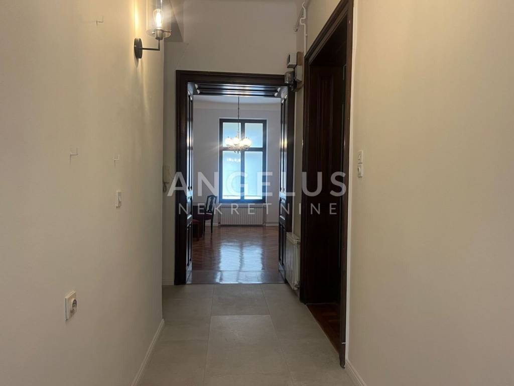 Smješten je u visokom prizemlju zgrade sa novouređenim reprezentativnim haustorom, a sastoji se od ulaznog hodnika, 3 sobe, kuhinje, spremišta, djevojačke sobe, malog balkona, kupaonice sa toaletom i gostinjskog toaleta. Plinsko centralno grijanje.