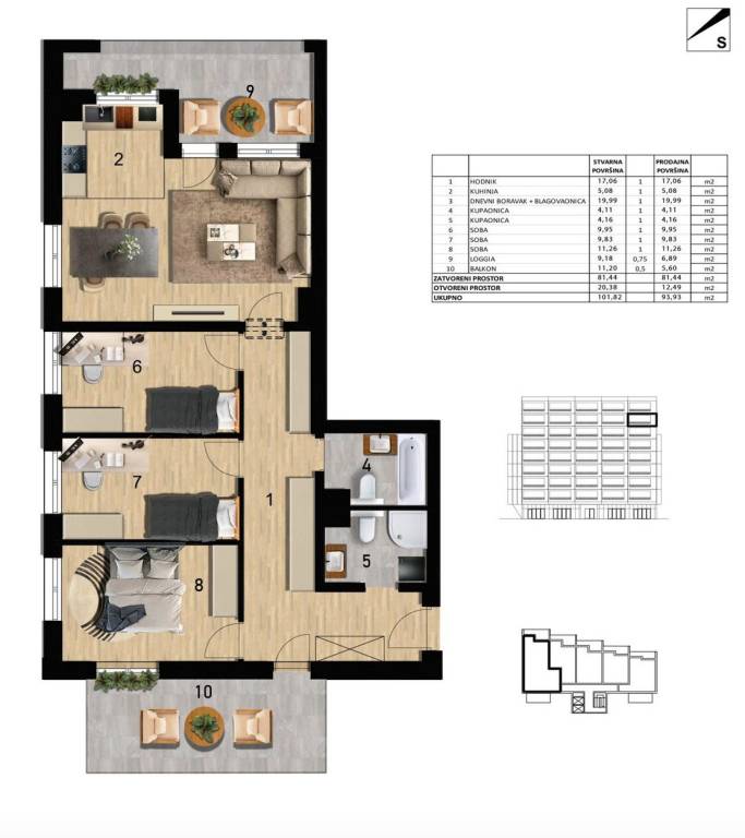 Četverosoban stan ukupne neto korisne površine 94 m2 smješten na 7. katu.Sastoji se od hodnika, kuhinje, dnevnog boravka s blagovaonicom, 2 kupaonice, 3 spavaće sobe, lođe te otvorene terase. (A7-1)--Projekt stambene novogradnje u mirnom zagrebačkom naselju Borovje. Moderna novogradnja koja spaja vrhunsku izvedbu, praktičnu lokaciju i udobnost života. Idealan izbor za obitelji, mlade parove, ali i sve koji žele sigurnu i dugoročnu investiciju u nekretnine.Udaljeno samo 11 km od Zračne luke Franjo Tuđman, 3,6 km od glavnog autobusnog kolodvora te 6,7 km od samog centra Zagreba, Borovje vam omogućuje brz i jednostavan pristup svim važnim gradskim točkama. Blizina autobusne linije dodatno osigurava odličnu prometnu povezanost, dok kvart nudi sve potrebne sadržaje za svakodnevni život - trgovine, škole, vrtiće i rekreacijske zone.Ovi stanovi ne nude samo lokaciju, već i izuzetnu kvalitetu izvedbe:· Energetski certifikat: Klasa A· Konstrukcija: unutarnji i vanjski armirano-betonski zidovi debljine 25 cm, pregradni zidovi unutar stanova od blok opeke debljine 12,5 cm, visina etaža 260 cm - za prozračne, svijetle prostore.· Krov: ravni neprohodni krov s termoizolacijom i PVC folijom.· Fasada: ventilirana - modernog izgleda i izvrsne toplinske izolacije.· Vanjska stolarija: troslojna PVC stolarija, antracit boja izvana, bijela iznutra.· Stubište: zgrada je opremljena s dva dizala koja povezuju sve etaže.· Parkirna mjesta: osigurana garažna parkirna mjesta.· Zidovi: bojani bijelom bojom, s keramičkim pločicama u kupaonicama i kuhinji.· Podovi: kombinacija laminata i keramičkih pločica.· Unutarnja stolarija: protuprovalna i protupožarna ulazna vrata.· Grijanje: podno grijanje
