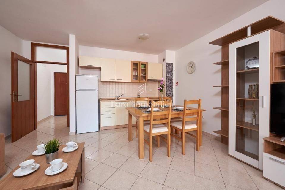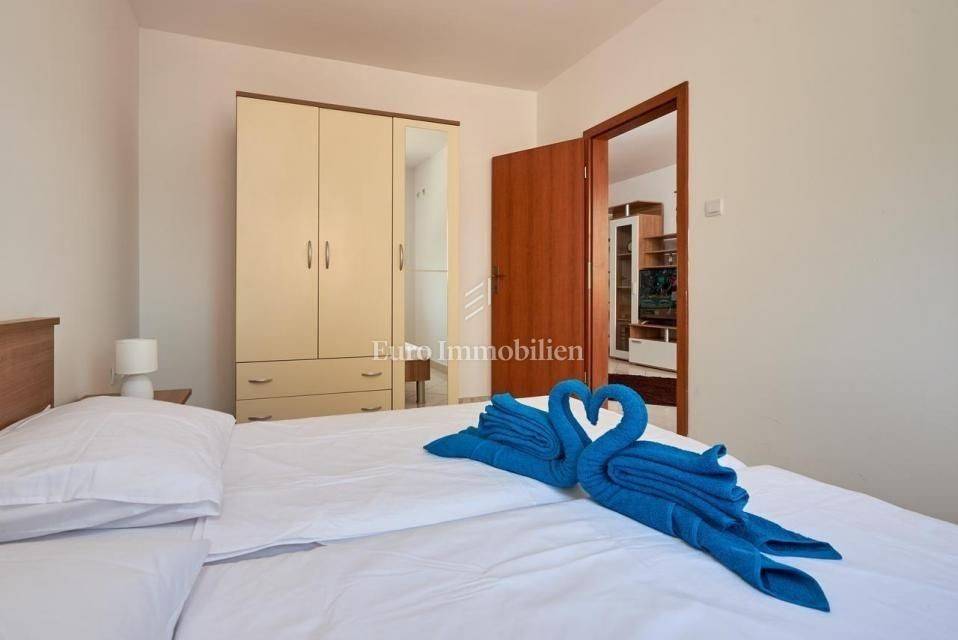Island of Krk, Malinska, one bedroom apartment of 37 m2 is located on the first floor of the apartment building. It consists of one bedroom, living room with kitchen and dining room, hall, bathroom and loggia. Quality construction. Furniture partially included in the price. One parking space. Good location, approx. 500 meters from the beach!