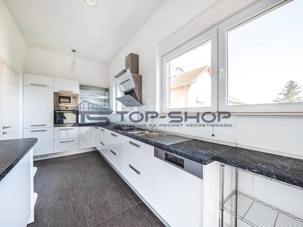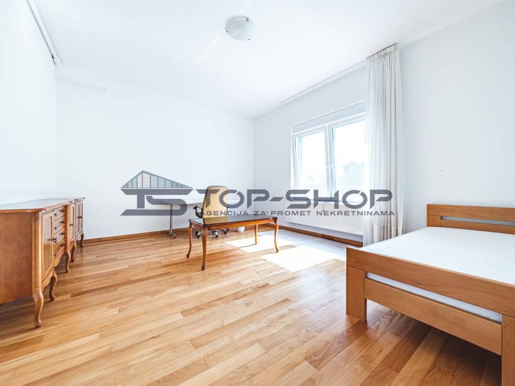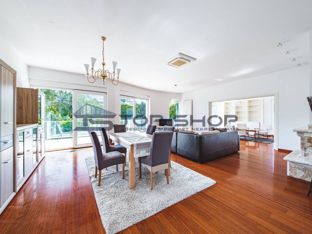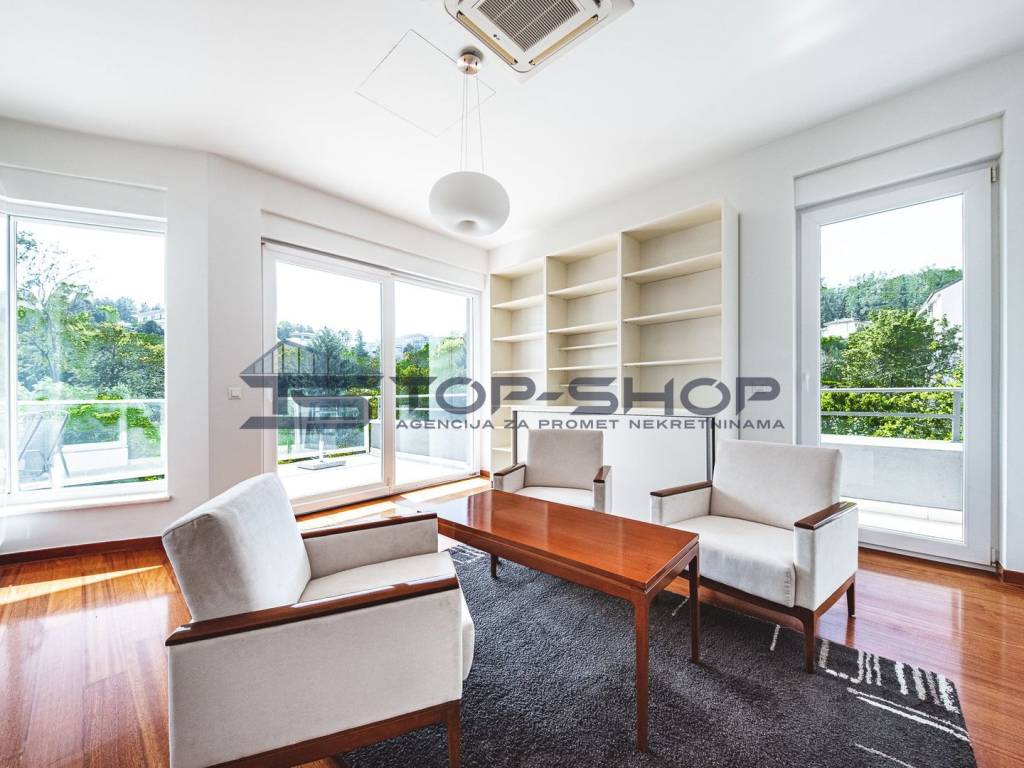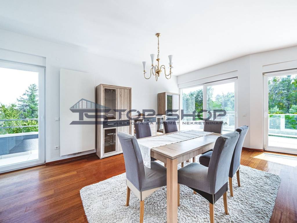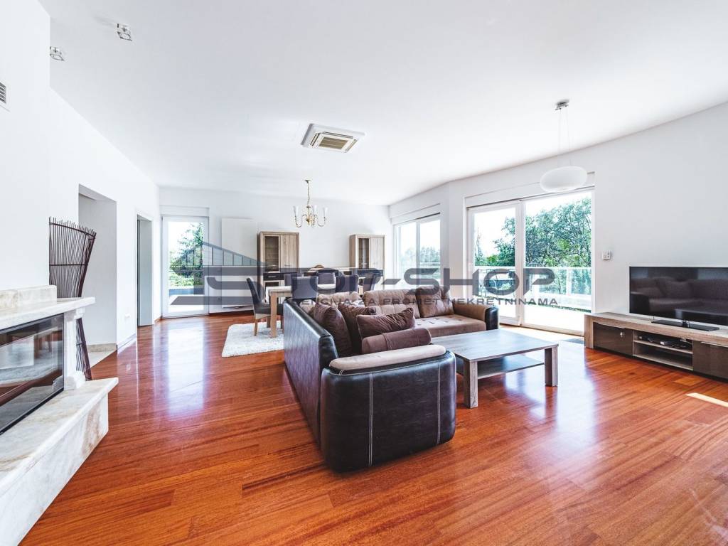 The apartment features a carefully designed layout and includes a separate living room, a separate kitchen, a dining room, and four bedrooms. It consists of: an entrance hallway with a lift that provides direct access to the apartment, a spacious living room with a fireplace and dining area, and access to two balconies and a beautiful terrace overlooking the city of Zagreb and greenery, a fully equipped kitchen, 4 bedrooms with built-in wardrobes (two bedrooms have en-suite bathrooms with toilets and showers), two bathrooms with toilets, a separate toilet, a laundry room, and a large storage room.