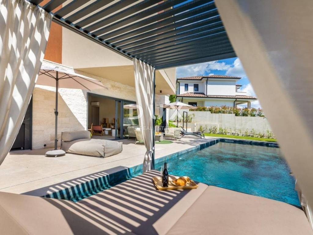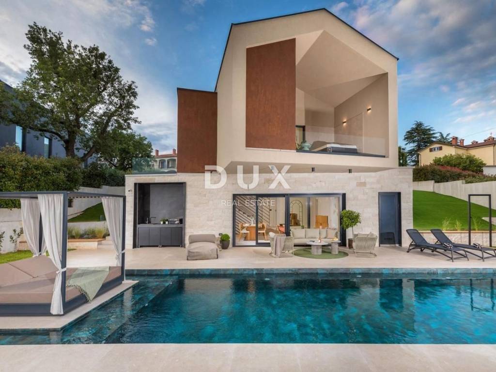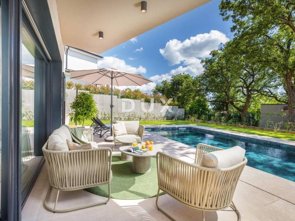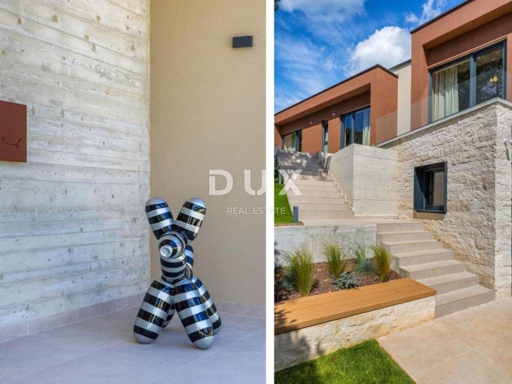 ISTRIA, POREČ - Designer house with swimming pool Bathed in a pleasant Mediterranean climate, located in the heart of the western Istrian coast, the ancient town of Poreč and its coastline of preserved natural beauty, landscaped parks, pine and oak groves that reach the sea itself, along which the clear sea, beaches, bays and islands alternate, spreads over an area of 139 km² and consists of 58 settlements. With the identity of an urban coastal city, Poreč is a city of culture, sports, entertainment, a city of tourism and true hospitality. One of the most attractive cities of Croatian tourism that uniquely combines the natural beauty of Istria, a rich cultural and historical heritage and the most modern amenities of a top tourist destination. The harmony of the old town core, which is a cultural monument, with one of the most famous Istrian cultural monuments, the Euphrasian Basilica, which is on the UNESCO World Heritage List, and the most well-maintained and best-equipped tourist settlements on the Adriatic, forms a mosaic of unforgettable experiences. Poreč is also a city that is much more than a summer destination of sun and sea. Poreč is a city tailored to the needs of a person. A city in which there is a constant impulse to improve living conditions and make progress in various spheres greater. A city that is a pleasant, safe and well-maintained place to live where everyone can find their place, a city without surtaxes with high social sensitivity for all generations. In a small, charming town near the town of Poreč, a designer house with a swimming pool is for sale. The property represents a harmony of space, needs, functions, construction and beauty. The location offers an authentic experience of a small Istrian town, intimacy and a break from the noise and is also close to dynamic Istrian towns with a range of facilities. In addition to the location that provides complete comfort, the property is also characterized by the quality of construction, which guarantees long-term satisfaction and quality of living. It is characterized by modern architecture with dynamics in the design of the exterior and interior. The combination of clean lines, stone and glass has achieved a special visual character and a very modern design. In accordance with the pure modernist architecture, the interior of the house, bathed in natural light, stands out with a minimalist style through top-quality equipment and elements of modern, custom-made furniture. The house is designed as a single residential unit spread over two floors. The main entrance to the house is on the upper floor. The upper floor consists of four bedrooms, three bathrooms, a living room with access to a loggia containing a sauna and a hot tub, and an entrance hall/hallway with a staircase. At the same level as the upper floor, a carefully designed driveway offers parking spaces as well as access to the lower floor and the courtyard via an external staircase. The lower floor consists of an open concept space that unites the living room, dining room and kitchen, which opens with sliding glass walls onto a covered terrace facing the outdoor area and a heated swimming pool with a sunbathing area. The floor plan is complemented by a guest toilet, storage room and a technical room. The yard is ambientally and horticulturally decorated and fenced. The location, structure and comfort make this property an ideal opportunity for a peaceful family life as well as for an investment for the purpose of tourist rental. The seller of the property in question is a legal entity and the listed price includes VAT. Dear clients, the agency commission is charged in accordance with the General Business Conditions: www.dux-nekretnine.hr/opci-uvjeti-poslovanja ID CODE: 42193 Iva Zajc Agent s licencom Mob: +385 92 235 9472 Tel: +385 99 640 8438 E-mail: iva@dux-istra.com www.dux-istra.com