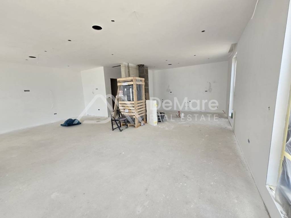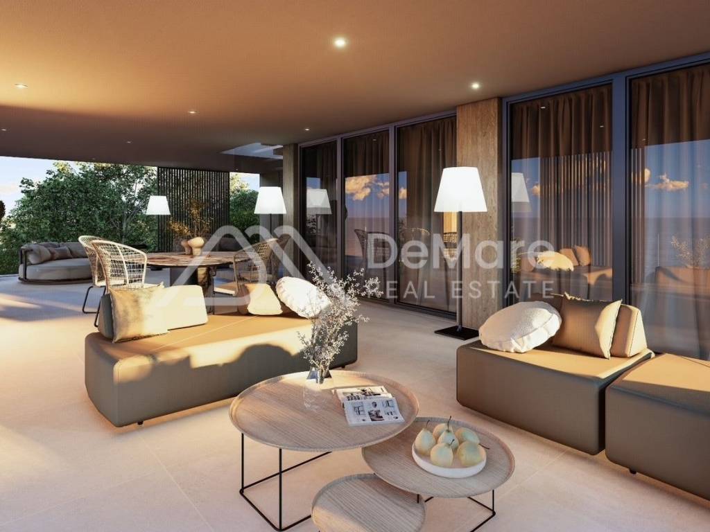 This comfortable, luxurious apartment extends across the entire ground floor of the building, and large glass walls divide the dining room and living room from a covered terrace with a sea view, where a summer kitchen can be placed, as well as furniture for dining and outdoor living.
