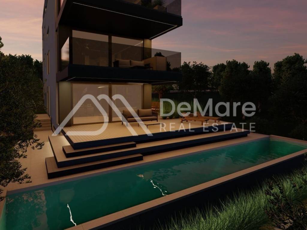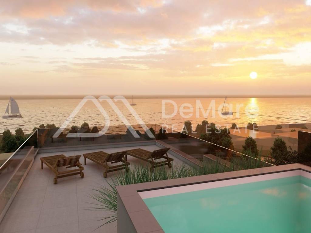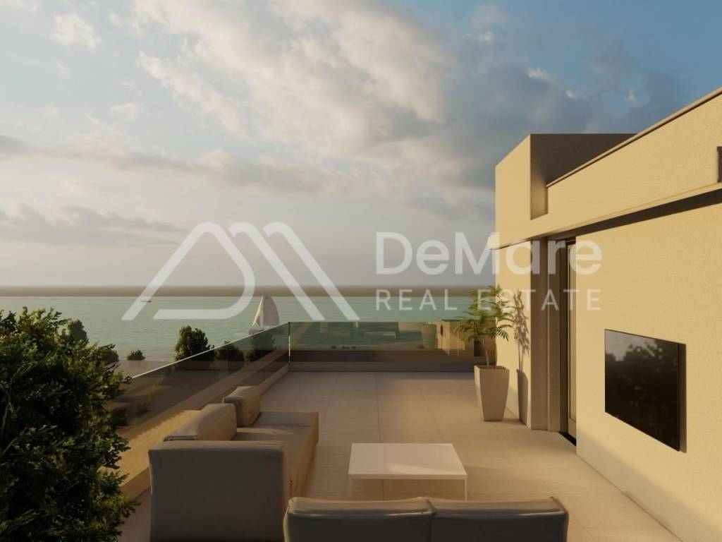 A luxurious PENTHOUSE apartment in a NEW BUILDING with a total of 4 residential units is for sale, in an exceptional location - third row to the sea, only 100 meters from the sea and the beach. The building consists of a basement, ground floor, first and second floors, and a spacious roof terrace with a beautiful panoramic view of the sea and islands. All floors are connected by an elevator.