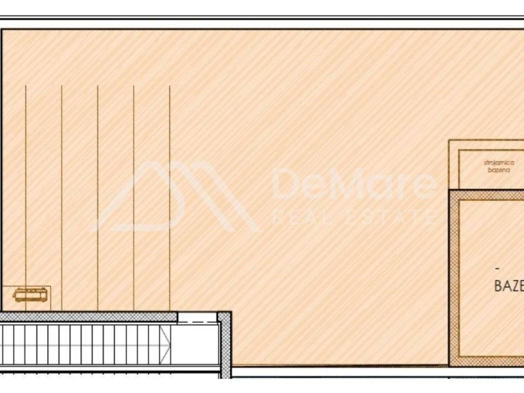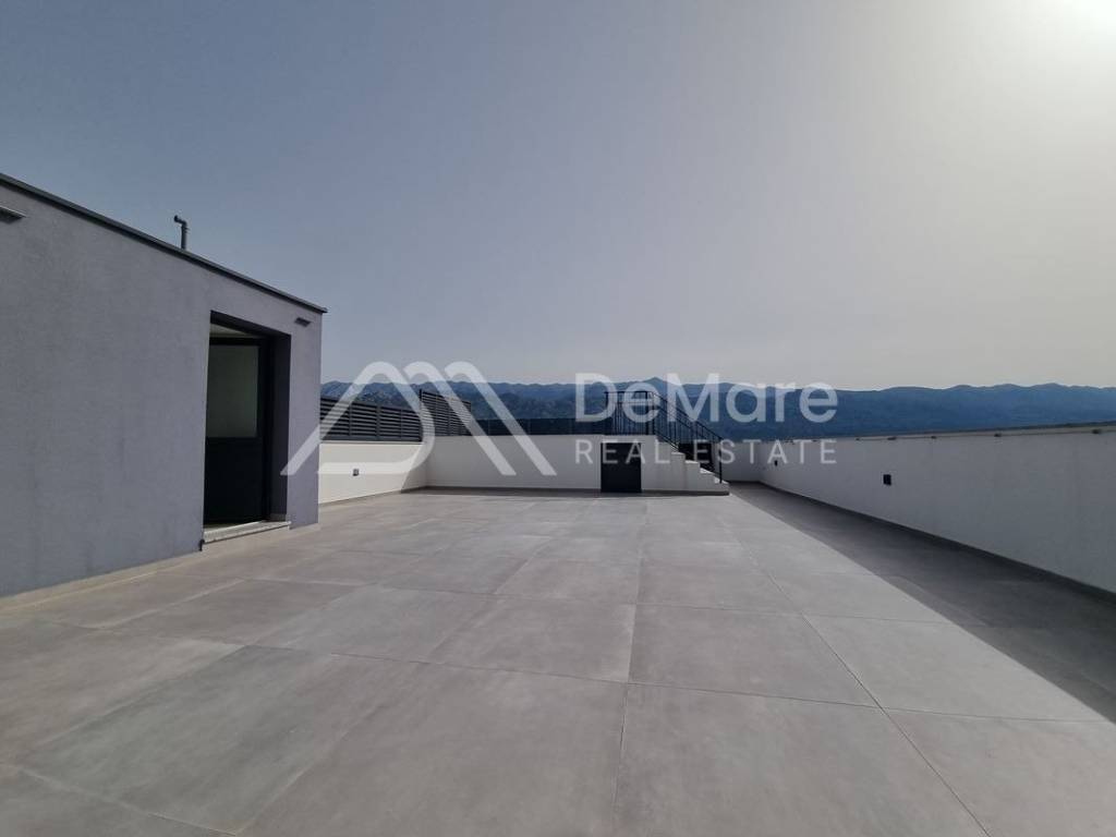 On the flat roof above the apartment, there is a spacious terrace with a panoramic view of the sea and the Velebit mountain, the surface of which is 100 m2, and there is a built-in swimming pool (approx. 14 m2), as well as all infrastructure connections, so it can also be arranged and equipped for outdoor living, according to the future owners' wishes.