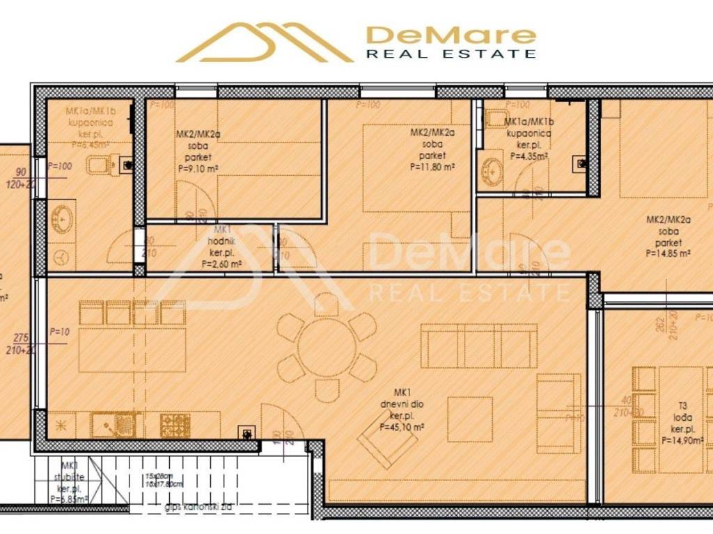 The internal living area of the apartment is 94.45 m2, while the total calculated useful value of the area of the apartment is 141.04 m2.