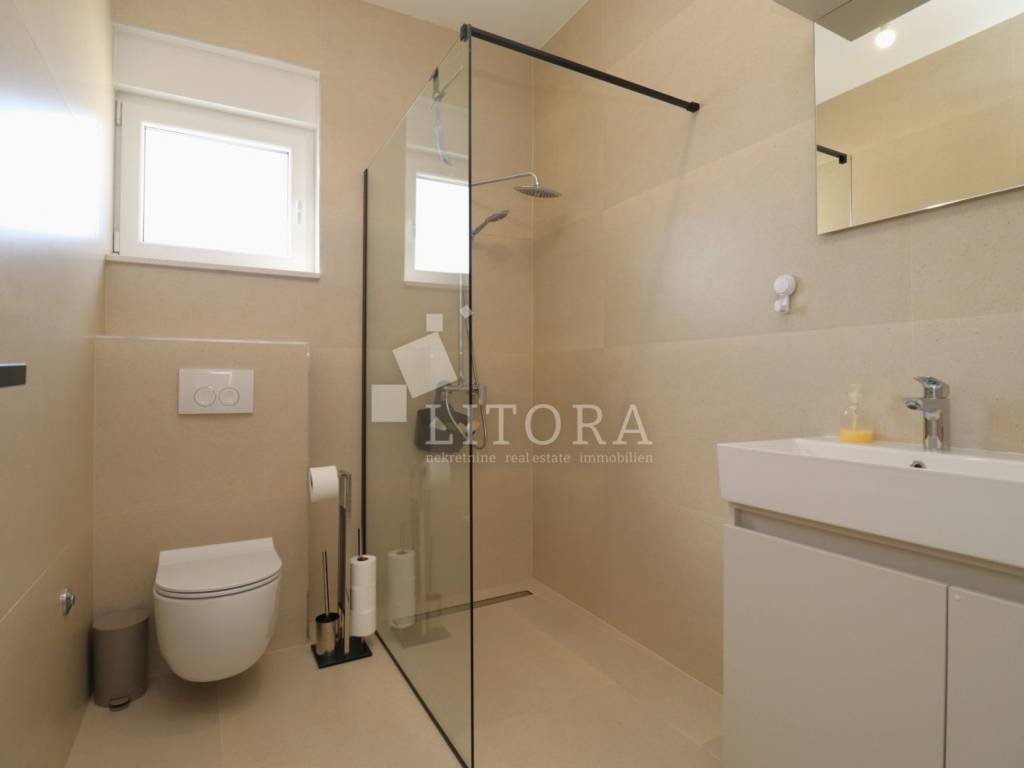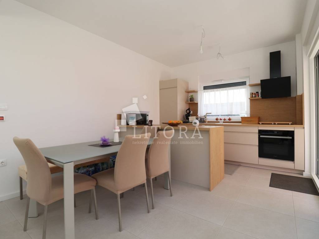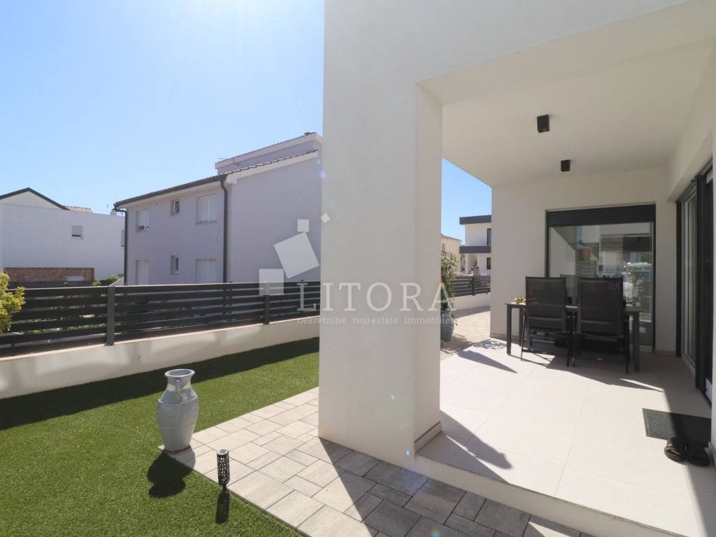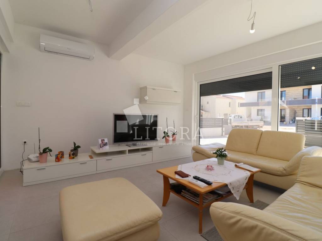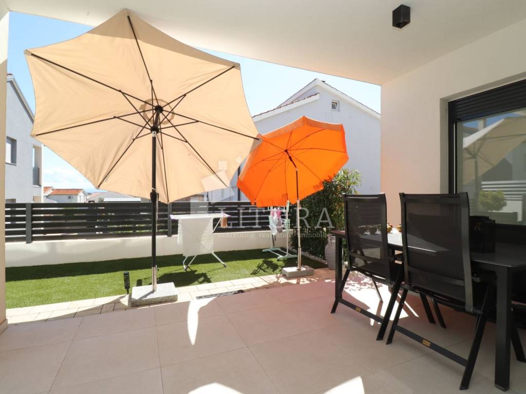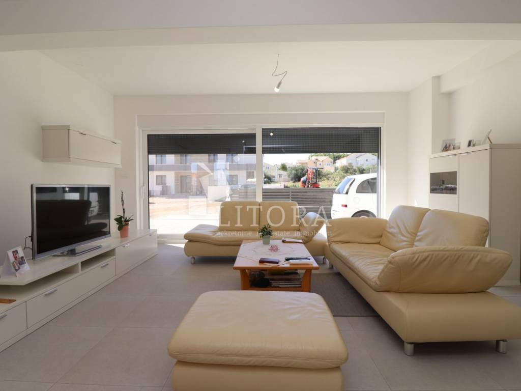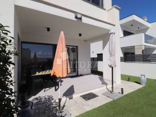 Vodice – peaceful location, newly built comfortable three-bedroom apartment with garden. The apartment is located on the ground floor of a small building with only two residential units. It occupies the entire ground floor, has separate Entrance and has 105.31 m² of living space. It consists of a hallway, three bedrooms, a bathroom, a guest toilet, a spacious living room with kitchen and dining area, and access to a covered terrace of 11.4 m², surrounded by a private garden. The apartment is south-facing and features large glass walls that provide plenty of natural light. The private garden of 162 m² is partly covered with artificial grass, while the other part is paved and used as a spacious parking area. The location is excellent – the apartment is only 1,100 m from the town centre and 1,500 m from the popular Blue Beach. It is equipped with air conditioning, a chimney connection, underfloor heating in the living room, and electric roller shutters. The apartment is fully furnished, and the furniture is included in the property price.