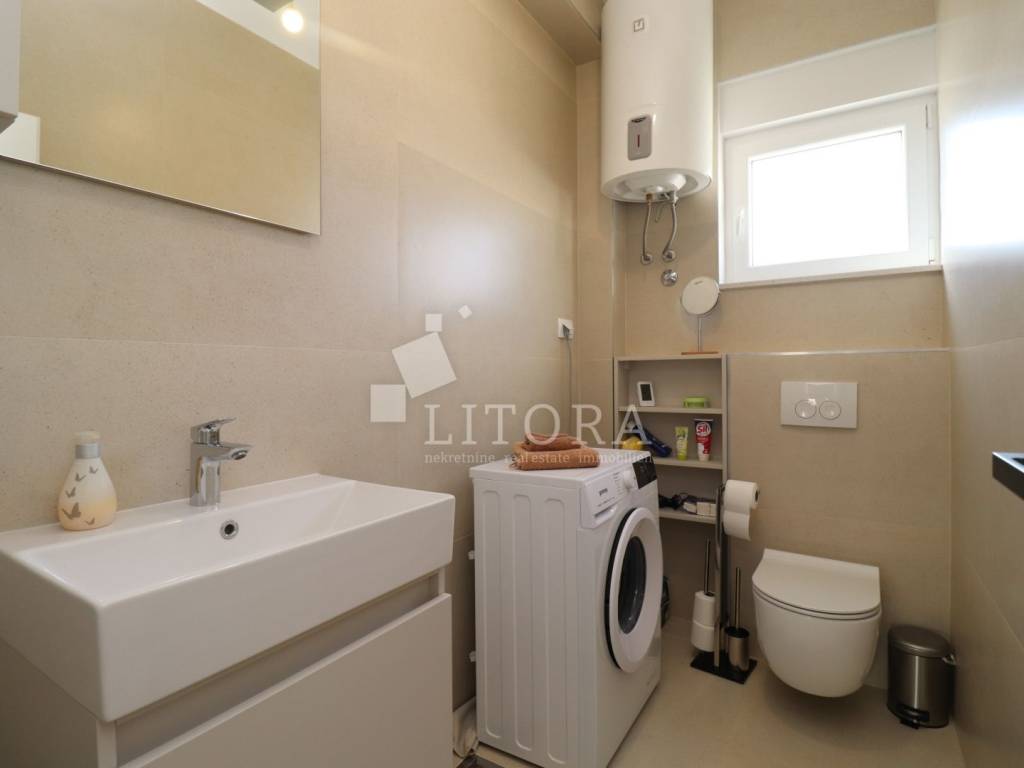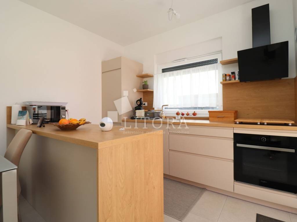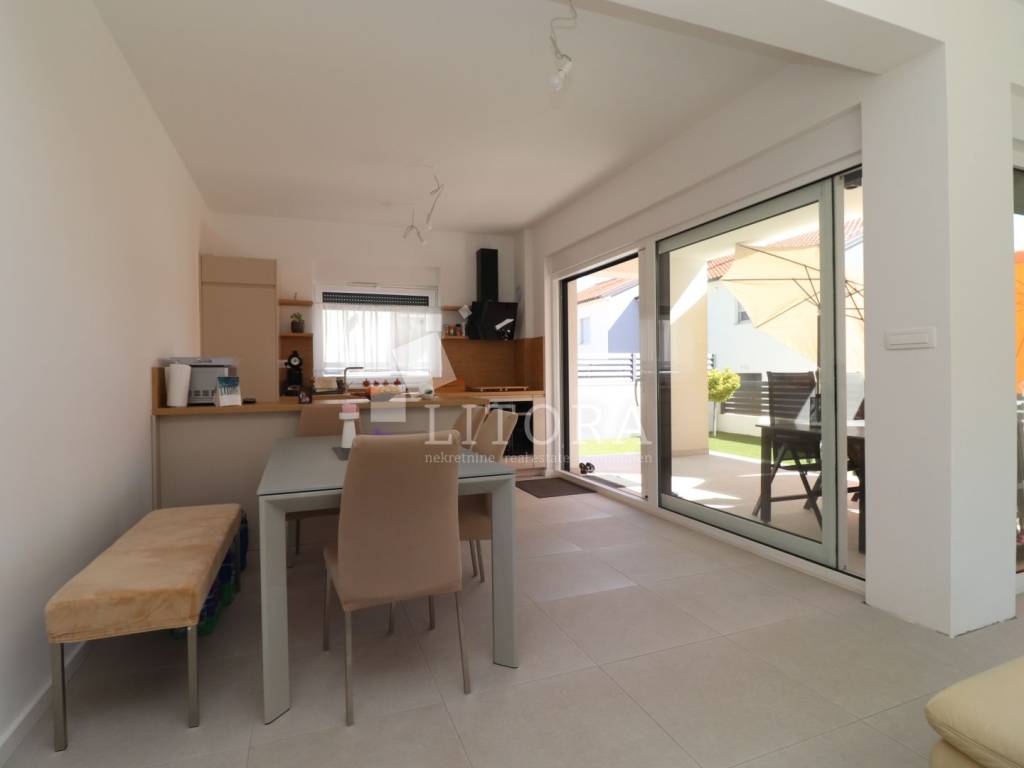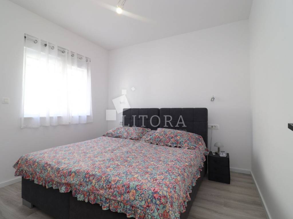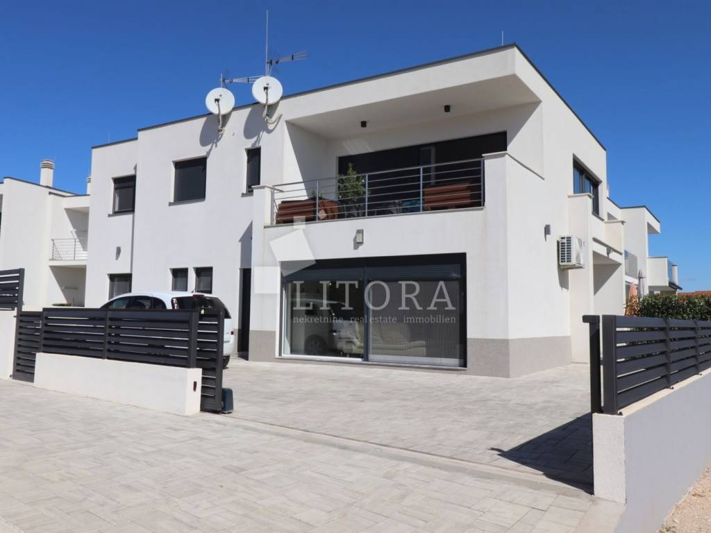Vodice – peaceful location, newly built comfortable three-bedroom apartment with garden. The apartment is located on the ground floor of a small building with only two residential units. It occupies the entire ground floor, has separate Entrance and has 105.31 m² of living space. It consists of a hallway, three bedrooms, a bathroom, a guest toilet, a spacious living room with kitchen and dining area, and access to a covered terrace of 11.4 m², surrounded by a private garden. The apartment is south-facing and features large glass walls that provide plenty of natural light. The private garden of 162 m² is partly covered with artificial grass, while the other part is paved and used as a spacious parking area. The location is excellent – the apartment is only 1,100 m from the town centre and 1,500 m from the popular Blue Beach. It is equipped with air conditioning, a chimney connection, underfloor heating in the living room, and electric roller shutters. The apartment is fully furnished, and the furniture is included in the property price.