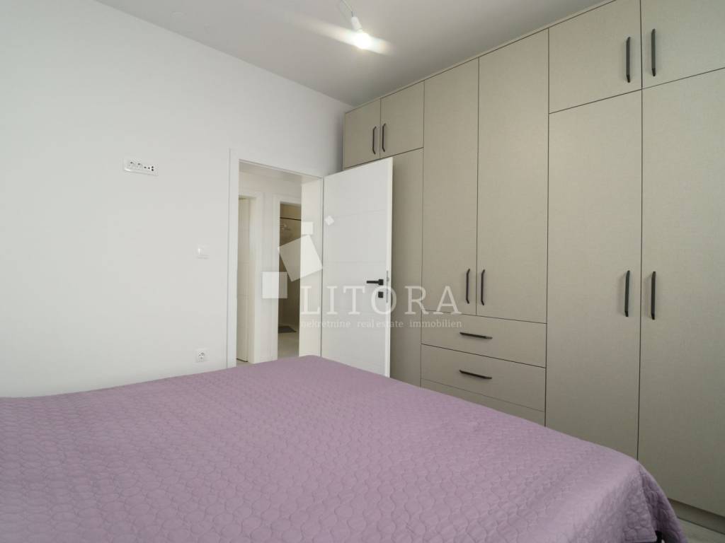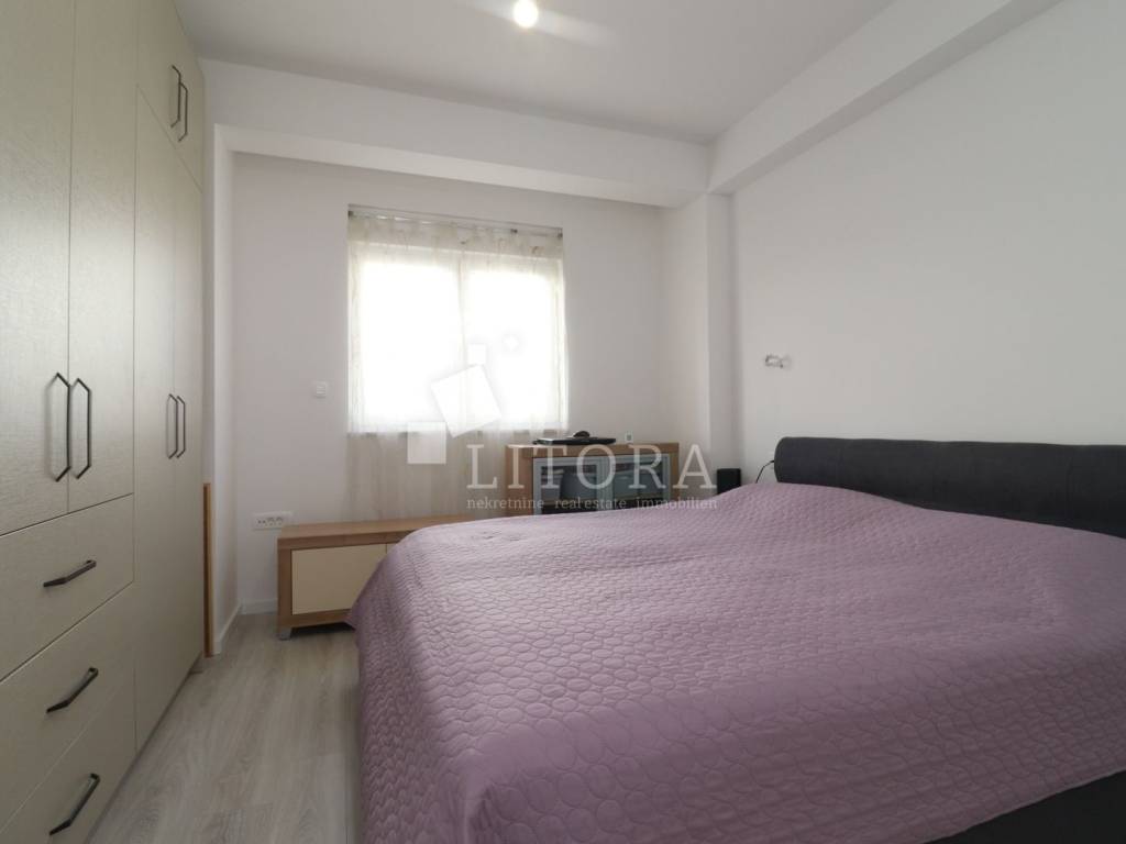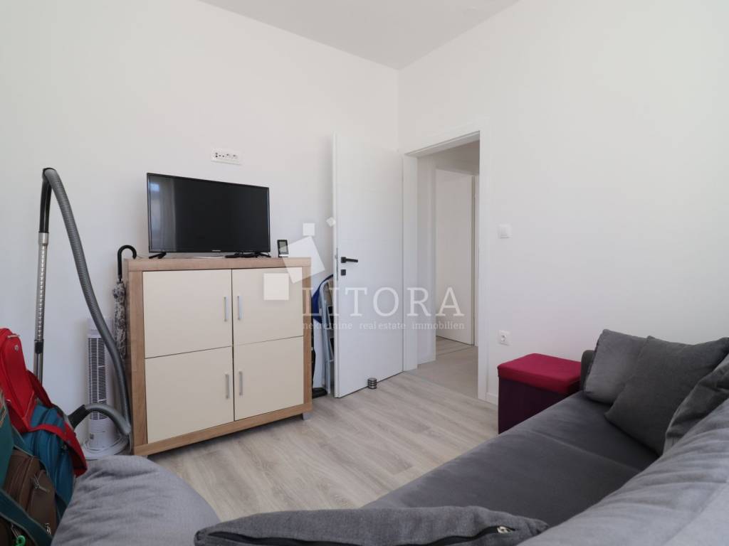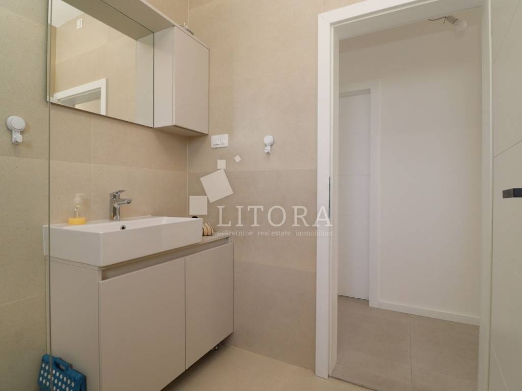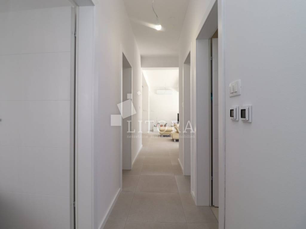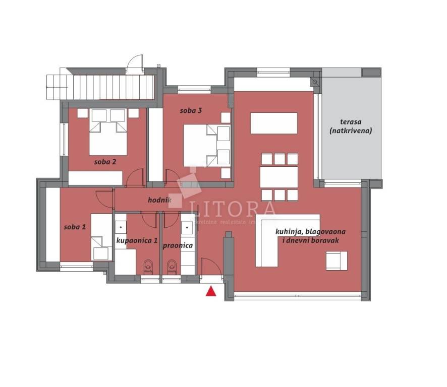 Vodice – peaceful location, newly built comfortable three-bedroom apartment with garden. The apartment is located on the ground floor of a small building with only two residential units. It occupies the entire ground floor, has separate Entrance and has 105.31 m² of living space. It consists of a hallway, three bedrooms, a bathroom, a guest toilet, a spacious living room with kitchen and dining area, and access to a covered terrace of 11.4 m², surrounded by a private garden. The apartment is south-facing and features large glass walls that provide plenty of natural light. The private garden of 162 m² is partly covered with artificial grass, while the other part is paved and used as a spacious parking area. The location is excellent – the apartment is only 1,100 m from the town centre and 1,500 m from the popular Blue Beach. It is equipped with air conditioning, a chimney connection, underfloor heating in the living room, and electric roller shutters. The apartment is fully furnished, and the furniture is included in the property price.