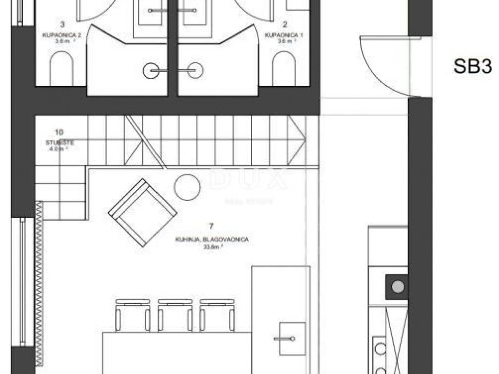 ZADAR, ZATON - Two-storey penthouse with a beautiful view 95 meters from the sea! SB3. Just 95 meters from the sea, in the quiet town of Zaton, a modern project is being built with nine luxury apartments located in a closed resort with a ramp at the entrance. The settlement is designed as a private oasis, consisting of five buildings, where residents enjoy complete security and privacy. Apartments on the upper floors have spacious roof terraces with a beautiful view of the sea and islands, while ground floor units have their own gardens. There is also the option of purchasing fully furnished apartments for an additional fee. Special attention has been paid to interior design, modern technological solutions and quality materials to make the home functional, safe and comfortable. The smart home system allows for the control of lighting, air conditioning and heating, and the construction is carried out with a reinforced concrete structure with 10 cm of thermal insulation. Aluminum joinery with electric shutters, multi-split air conditioners, underfloor heating in the bathrooms and living room, video intercom, surveillance cameras and burglar and fire doors are part of the standard equipment. First-class sanitary ware and floor coverings from renowned manufacturers were used. The planned completion of the works is by the end of 2025. The two-story penthouse SB3 is located on the second floor and consists of two bedrooms, three bathrooms, a storage room and a spacious living area with a kitchen and dining room. Its special value is the roof terrace with a beautiful view of the sea and a parking space in the garage. There is a possibility of changing the floor plan and adding another bedroom, in which case the price would be €1,284,000 Zaton is a quiet Dalmatian town known for its crystal clear sea, pebble beaches and relaxed Mediterranean atmosphere, while Zadar is nearby - a city rich in history, cultural attractions and top-notch restaurants, an ideal destination for living and vacation. The seller is a legal entity and the buyer does not pay real estate tax. For all additional information and to arrange a viewing, please feel free to contact us. Dear clients, agency commission is charged in accordance with the General Terms and Conditions: www.dux-nekretnine.hr/opci-uvjeti-poslovanja ID CODE: 42284 Josip Šestan Agent s licencom Mob: +385 91 799 6986 Tel: +385 91 480 8808 E-mail: josip@dux-dalmacija.com www.dux-dalmacija.com