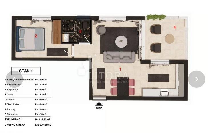 Brodarica Prestige Residences, an exclusive residential project in close proximity to the sea. Residence 1 – Apartment S1, with a total usable area of 64.23 m², is located on the ground floor of a smaller residential building. The apartment has an area of 42.70 m² and consists of one bedroom, a bathroom, a kitchen with dining area that opens onto a terrace of 8.93 m² and a courtyard of 65.80 m². The apartment includes a parking space of 16 m² (with the option to purchase an additional one) and a storage room of 3.20 m². It will be equipped with high-quality premium stone wool insulation, aluminum joinery with insect screens and triple glazing, premium ceramics and sanitaryware, premium three-layer parquet, underfloor heating in the bathroom and living room, and air conditioning units. The courtyard will be landscaped with greenery, a pergola on the terrace, a barbecue, and underground waste containers. Completion and move-in are scheduled for the end of 2026. The distance to the sea/beach is only 80 meters, making this property ideal for a peaceful family life or for tourist rental