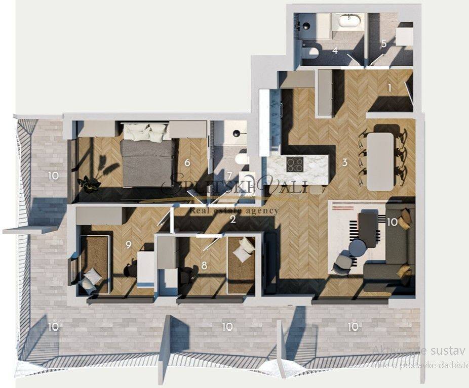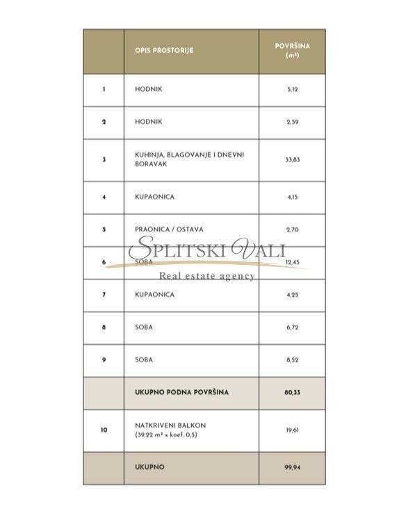 Ekskluzivno posredujemo u prodaji više stambenih jedinica u novonastajućem kvartu smještenom na atraktivnoj lokaciji na Duilovu.Ovaj projekt nudi modernu arhitekturu, visokokvalitetne materijale i pažljivo osmišljene stambene jedinice koje zadovoljavaju sve potrebe suvremenog stanovanja.Lokacija pruža idealno mjesto za obiteljski život, s blizinom svih potrebnih sadržaja kao što su škole, vrtići, trgovine i javni prijevoz. Uz to, prekrasan pogled na more i prirodu čini ovaj projekt savršenim izborom za one koji traže miran i ugodan životni prostor.Ovaj projekt ponosno ističe inovativnu arhitekturu sa dosad neviđenim dizajnom pročelja koja su pažljivo izvedena kako bi ponudila ne samo funkcionalnost, već i estetsku privlačnost.Svaka zgrada ima podzemnu etažu u kojima su smještena parkirna mjesta. Izlaz i ulaz u podzemnu garažu nalazi se na sjevero-istočnoj strani objekta. Također zgrada ima dizalo iz podzemne garaže pa sve do nadgrađa. Energetski certifikat zgrada je projektiran za A+ razred.Koncept interijera predstavlja savršen spoj modernog dizajna i prirodnih materijala, stvarajući prostor koji je istovremeno elegantan i ugodan za život.U ponudi imamo više stanova različite kvadrature, orijentacije i cijene.Završetak gradnje očekuje se sredinom 2027. godine, a plaćanje je u fazama.ZGRADA "Orišac 1"-STAN 9Stan 9 nalazi se na visini prvog kata te se prostire na 99.94m2 netto površine, 80.33m2 unutarnje površine.Sastoji se od hodnika, dnevnog prostora s kuhinjom i blagovaonicom, dvije kupaonice, praonice/ostave, tri spavaće sobe te natkrivenog balkona južne i zapadne orijentacije.Za razgovor o samom projektu te o ponudi stanova lijepo vas molimo kontaktirajte nas na +385991600400 (Josipa).Kupac plaća agencijsku proviziju.Razgled nekretnine moguć je isključivo uz potpisani Ugovor o posredovanju, a što je u skladu sa Zakonom o zaštiti podataka i Zakonom o posredovanju i prometu nekretninama.