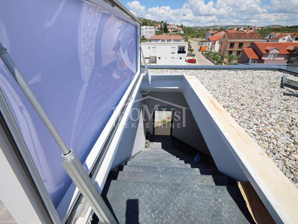 New building, two-story apartment S3 with a total usable area of 154.92m2 on the 1st and 2nd floor of an apartment building + roof terrace with a beautiful view of the sea. On the 1st floor there is a spacious kitchen with a dining room and a living room, a bathroom, two terraces. An internal staircase leads to the 2nd floor where there is a room with dressing room and bathroom and an exit to the terrace, two rooms, another bathroom and a hallway. The apartment also has a roof terrace of 80m2 with a beautiful view of the sea. The apartment has a modern architecture and a functional distribution, where high quality ceramic materials, sanitary ware and aluminum carpentry are installed with electric blinds, mosquito nets, parquet in the rooms and underfloor heating in the bathroom. The apartment also has a parking space. Garage spaces of 13m2-21m2 are available in the basement of the residential building at a price of 2,500 €/m2. Expected move-in in spring 2024. It is 220m to the sea and beach and 800m to the center.
