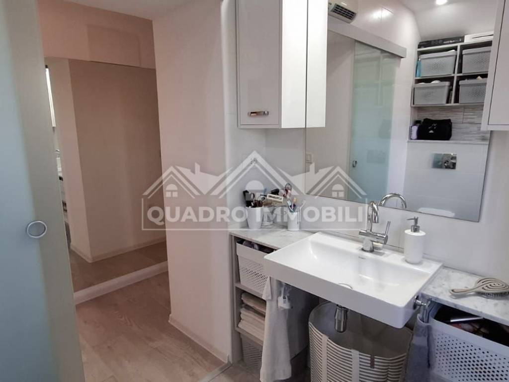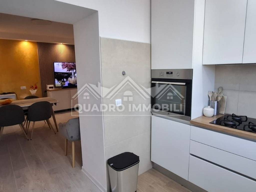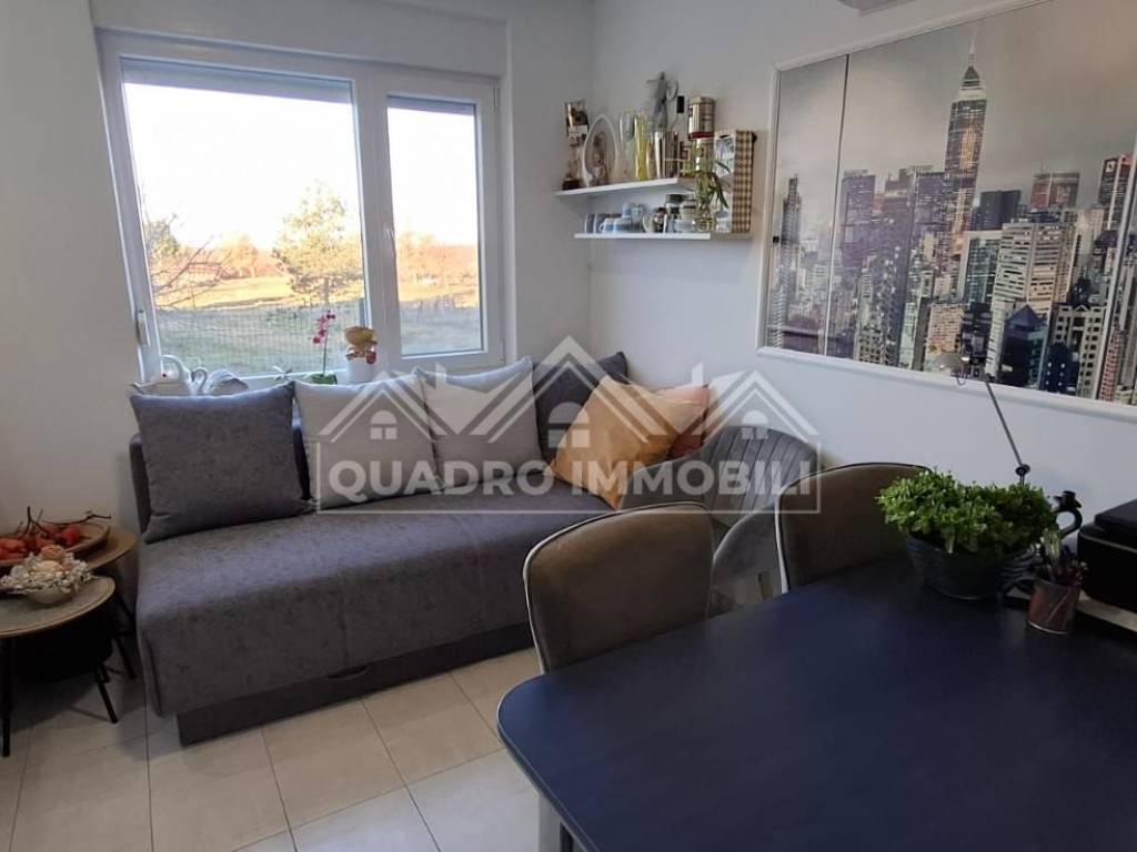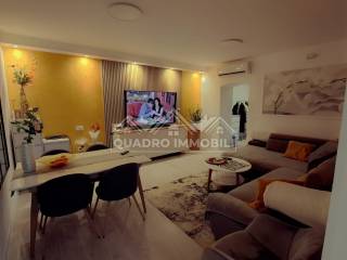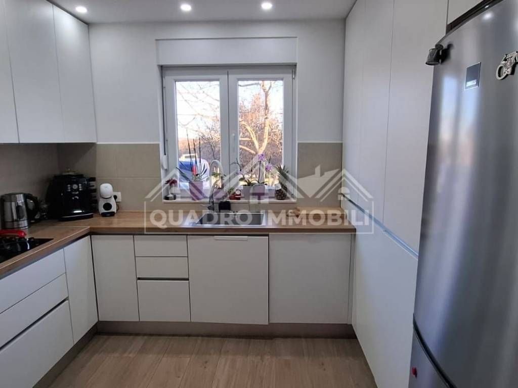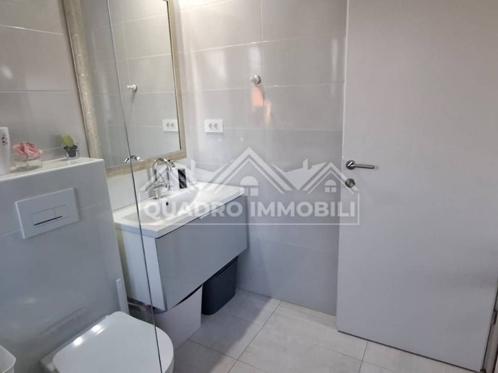 For sale is a ground floor apartment of 90 m2 with a yard in Buje in a quiet location. The apartment is in a house with two apartments with separate entrances. The apartment has a beautiful terrace of 40 m2 with a view of the sea. It has a garden of 200 m2 with 2 garages, a garden and parking. The apartment consists of a large entrance hall, a living room with a dining area, a large kitchen fully equipped in a modern style with all appliances, 2 comfortable bedrooms and each has its own bathroom. The apartment is fully furnished in a very nice modern style with taste and quality furniture because it was made for personal use. The joinery, tiles, bathrooms are all made of quality materials. There is also a 20 m2 storage room for storing and storing things. The apartment has 2 new air conditioners for cooling and heating and also an infrared panel and a radiator stove. It is located near the Aquarius pizzeria and only 350 m from the Konzum store. It is 8 km away from the border and Portorož and the beautiful beach in Kanegra.