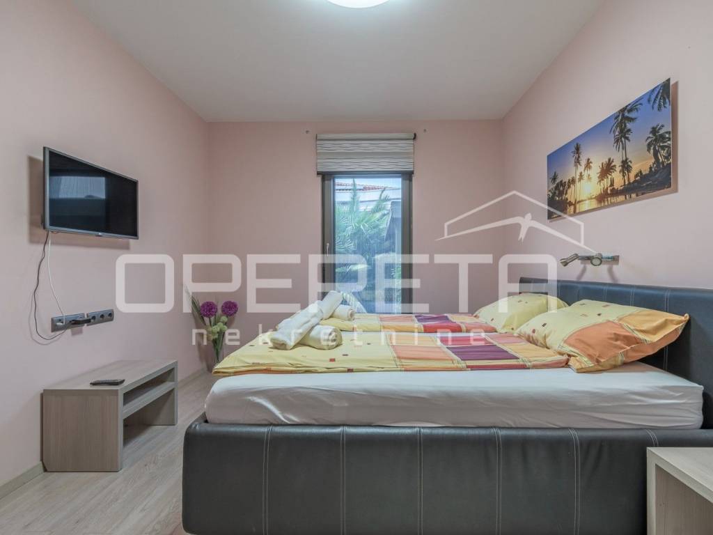 This semi-detached house is situated in the wider center of Poreč, in an exceptionally quiet location within one of the most desirable residential neighborhoods. Due to its position on the edge of the urbanized area, it offers a beautiful view of the greenery, and its southwest orientation ensures sunlight throughout the day. With a total living area of 143 m², it is spread over the ground floor and first floor and is divided into two separate residential units. The ground floor comprises an apartment with a hallway, storage room, one bedroom with an en-suite bathroom, kitchen, dining room, and a living room with a cozy fireplace, which opens onto a terrace and a nicely landscaped courtyard of 184 m². The courtyard also features a fully equipped summer kitchen with a grill, a bread oven, and connections for water and electricity, along with an additional storage room. The first floor houses the second apartment with two bedrooms, each having its own terrace with a view of nature, three bathrooms, and an open-plan kitchen, dining, and living area, which also exits onto a covered terrace. The property is equipped with modern systems: electric underfloor heating, air conditioning in all rooms, solar panels for hot water, and a fireplace on the ground floor. The house is ideal for comfortable year-round living or as an investment for tourist rental, and there is also a simple possibility of connecting it into a single spacious unit.