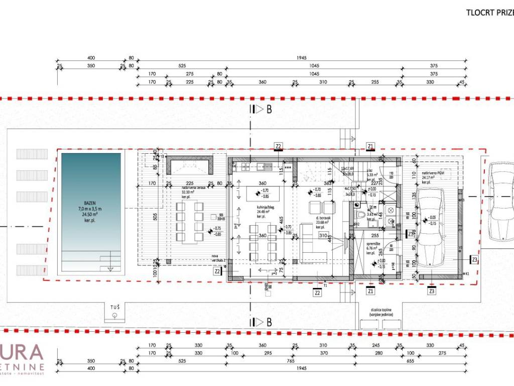 Имеется два парковочных места, бассейн площадью 30 м2 и крытая терраса площадью 56,78 м2.