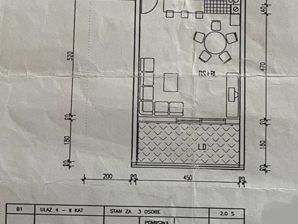 Sastoji se od: dvije spavaće sobe, dnevnog boravka, kuhinja + blagovaona, hodnika, kupaonice i lođe.