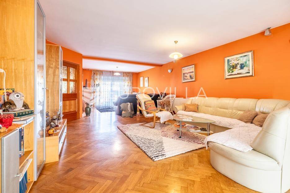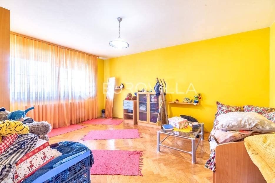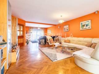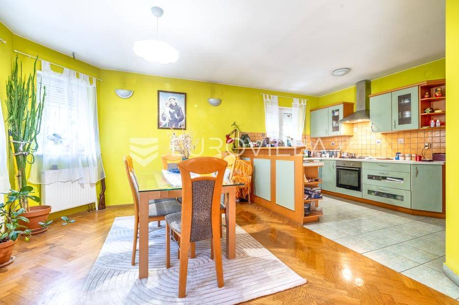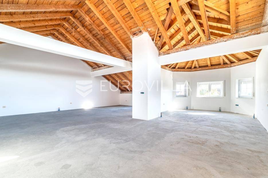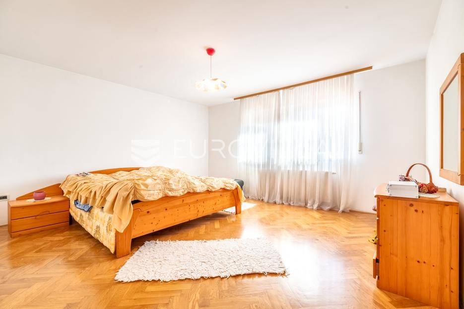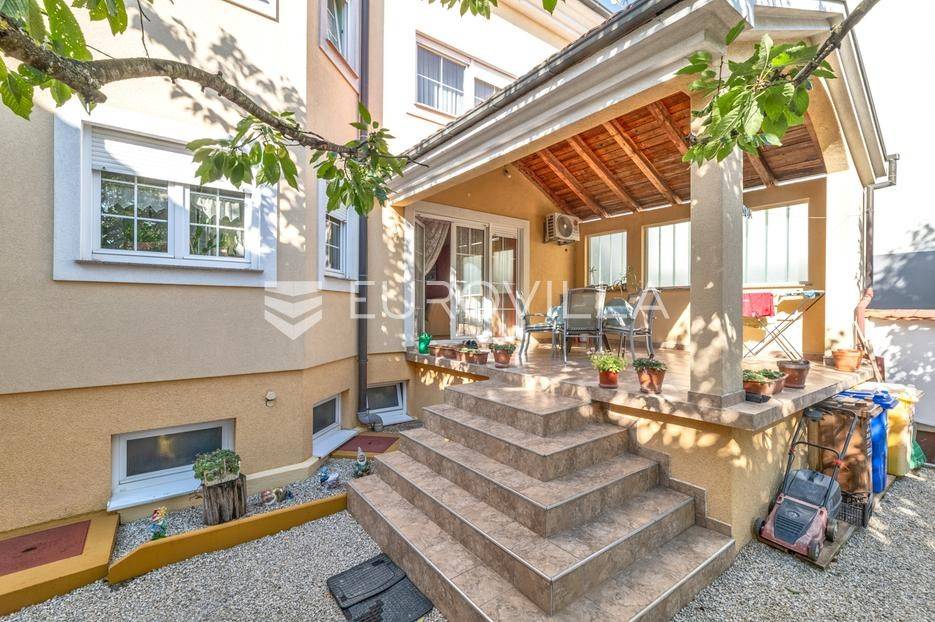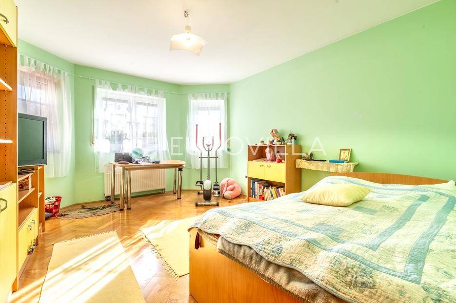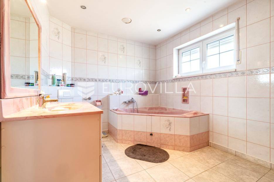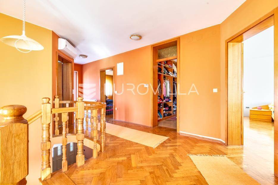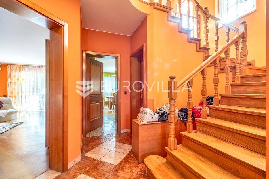 Velika Gorica, vrlo lijepa i kvalitetno građena obiteljska kuća površine 457 m2, razvedena na četiri etaže.Podrum, koji je u potpunosti uređen i ima četiri zasebne prostorije od kojih je jedna kotlovnica u kojoj se nalaze dva zasebna sustava centralnog grijanja, na gradski plin i kruta goriva, vešeraja, velike ostave i jedne vrlo prostrane prostorije za druženje. Visina stropa u podrumu 2,6 m.Prizemlje se sastoji od ulaznog hodnika, prostranog dnevnog boravka s izlazom na dvije terase, dvorišnu terasu ( 4,5m x 4,5m ) i terasu prema ulici, kuhinje s blagovaonicom te kupaonice s tušem i toaletom.Prvi kat, na kojemu su tri velike spavaće sobe, radna soba, kupaonica s kadom, prostrana garderoba, dvije terase na dvorišnu i prednju stranu kuće. Izdvojeno spremište.Potkrovlje je u visokom roh-bau stanju s novim krovom i gredama, svježe okrečeno, razvedeni svi priključci za struju, vodu, grijanje i telefon, potrebno je postavljanje parketa i montaža radijatora te keramike u kupaonici.Betonska gradnja u kombinaciji s ciglom, betonske grede, visina stropa 2,80 m, etažno plinsko grijanje, postavljena priprema za solarne panele, klimatizirana, fasada-termo žbuka, odlično održavana, uređen vrt. Dva natkrivena parkirna mjesta i dva nenatkrivena parkirna mjesta ispred kuće.Nalazi se u blizini centra i glavnog autobusnog kolodvora, na vrlo mirnoj lokaciji, u slijepoj ulici i vrlo ugodnom okruženju.Odlična prometna povezanost, blizina zračne luke 5 km.Za sve upite Vam stojimo na raspolaganju.