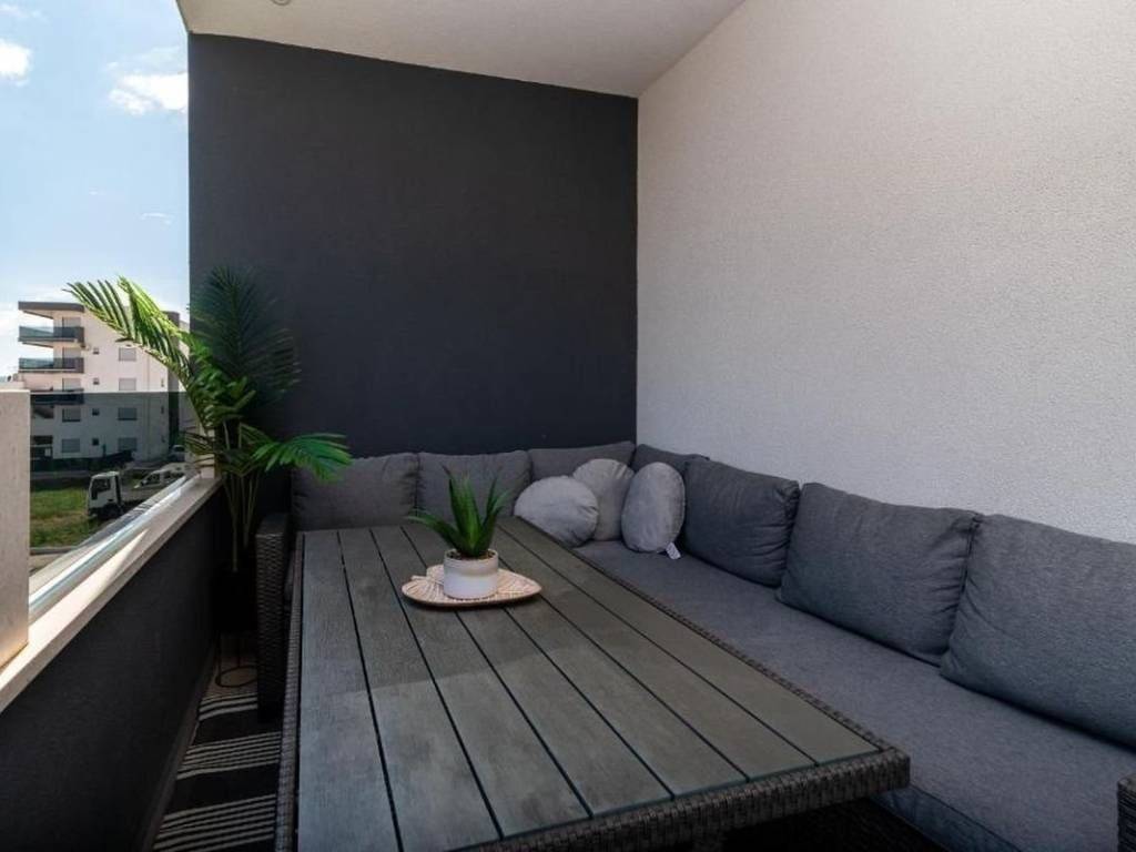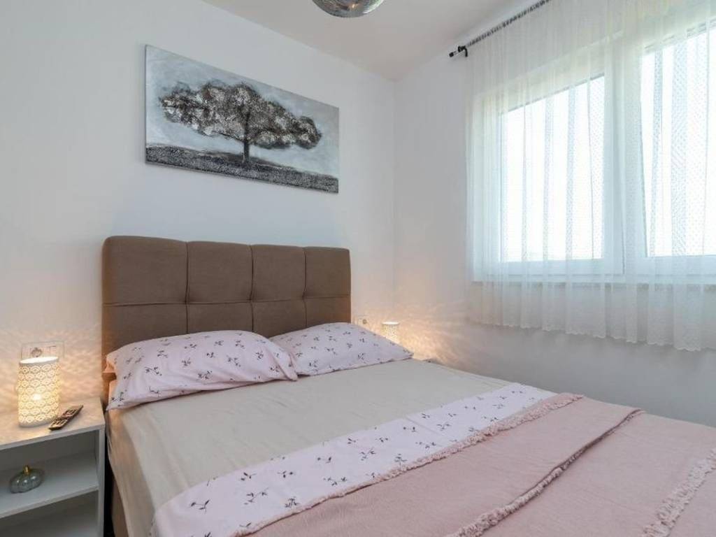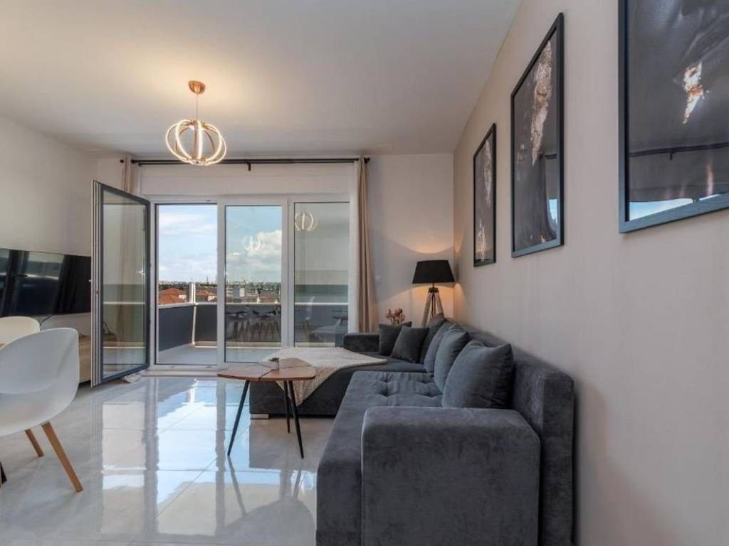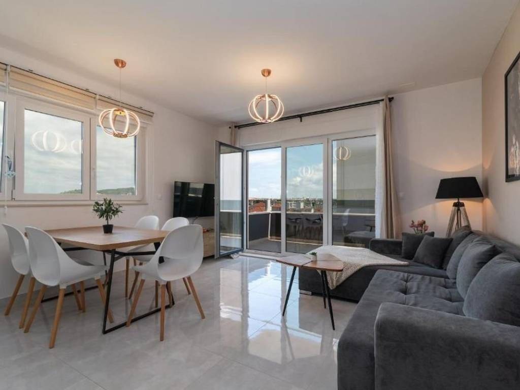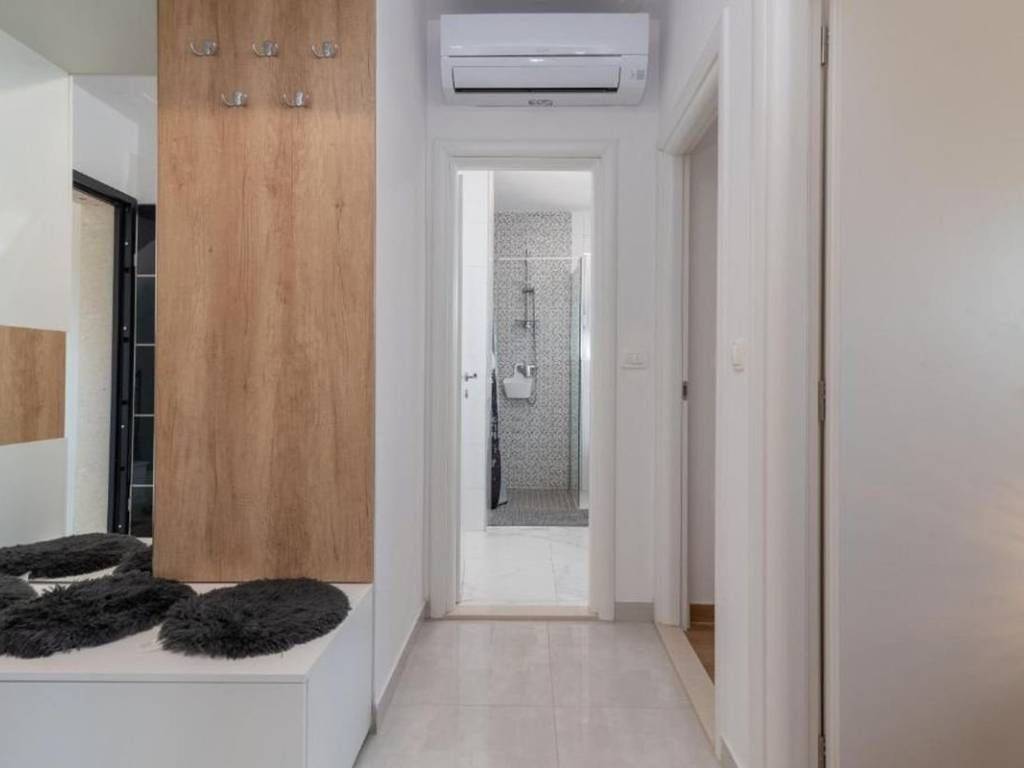 An attractive two bedroom apartment for rent located in a quiet and modernly decorated neighborhood in Trogir. The apartment is located on the second floor of a newly built residential building with an elevator, surrounded by similar new buildings and a quality landscaped environment. The total area of the apartment has 53,30 m², and the additional value is provided by a spacious balcony of 10,70 m² from which a partial view of the sea and the surrounding areas is offered. The apartment has a functional layout and consists of an entrance area and hallway, a modern bathroom with underfloor heating, two comfortable bedrooms and an open kitchen, dining room and living room with access to the balcony. The sleeping area of the apartment is oriented to the northeast, which ensures peace and a pleasant temperature during the warmer months, while the living area is oriented to the southeast, allowing plenty of natural light and a pleasant atmosphere throughout the day. The apartment is airconditioned and is rented fully furnished and equipped with high quality, modern furniture and is ready to move in immediately. The apartment comes with one outdoor parking space located behind the building. The building in which the apartment is located was built according to high standards – it is equipped with a video intercom, a security door, and the apartments also have a shared swimming pool and environment. This property represents an excellent opportunity for urban living. Thanks to its excellent location – close to all important facilities, beaches, restaurants and schools – the apartment offers a perfect combination of comfort, quality and affordability.