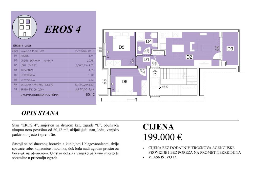 Stan "EROS 4", smješten na drugom katu zgrade “E”, obuhvaća ukupnu neto površinu od 60,12 m², uključujući stan, lođu, vanjsko parkirno mjesto i spremište. Stambeni dio površine 55,00 m² sastoji se od dnevnog boravka s kuhinjom i blagovaonicom, dvije spavaće sobe, kupaonice i hodnika, dok lođa nudi ugodan prostor za boravak na otvorenom. Uz stan dolazi i vanjsko parkirno mjesto te spremište u prizemlju zgrade.