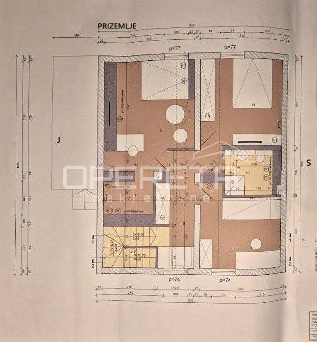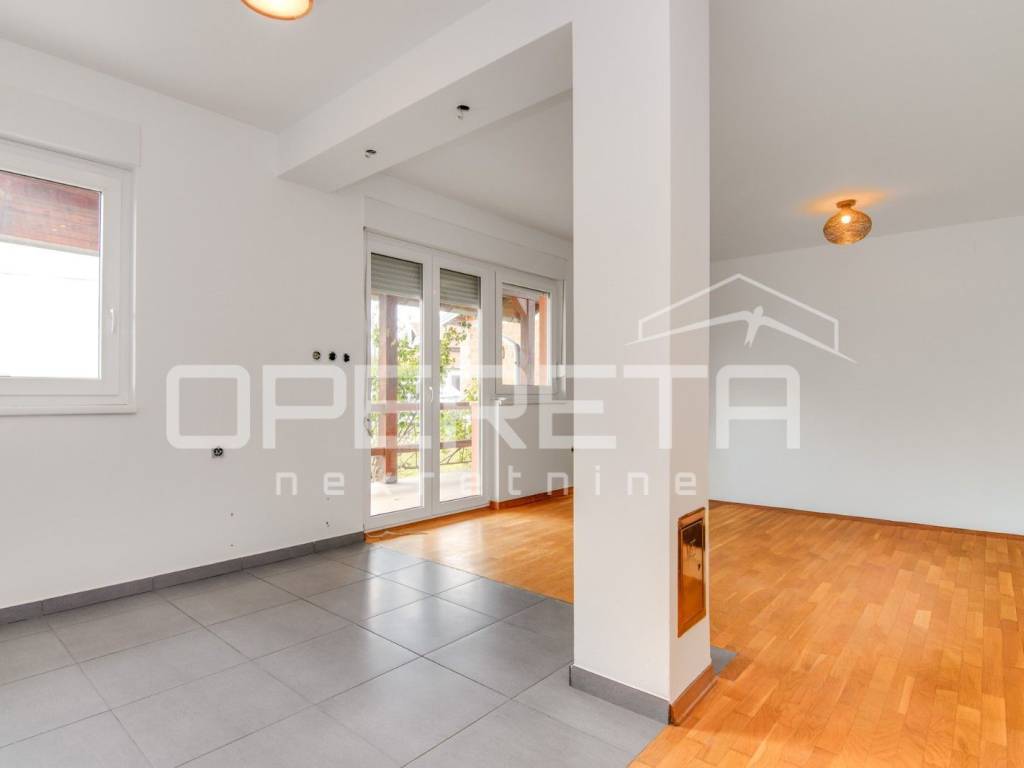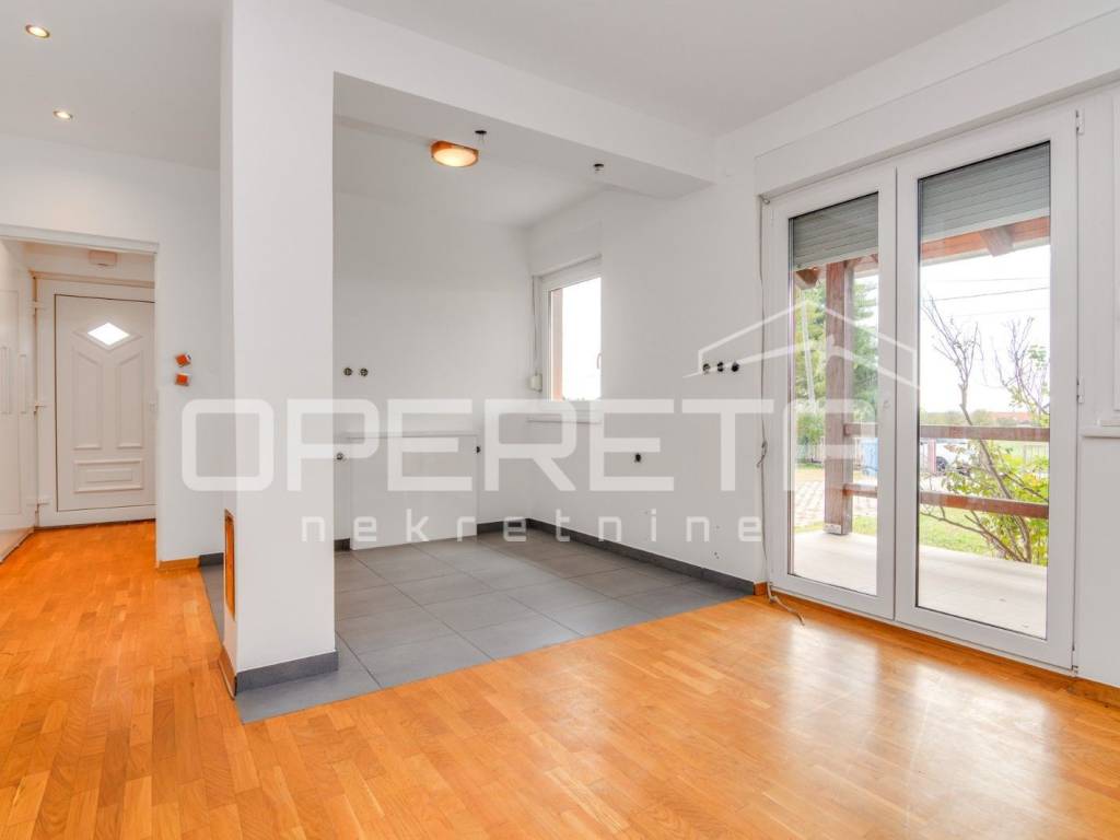 U prizemlju je ulazni predprostor sa stubištem, spremište ispod stubišta, dnevni boravak, blagovaonica s kuhinjom, koji izlaze na natkrivenu terasu, orijentiranu na jug, kupaonica i 2 sobe (u 1 sobi postoje sve instalacije i vodootporni laminat, te se ista može, po želji novih vlasnika, prenamijeniti u kuhinju).