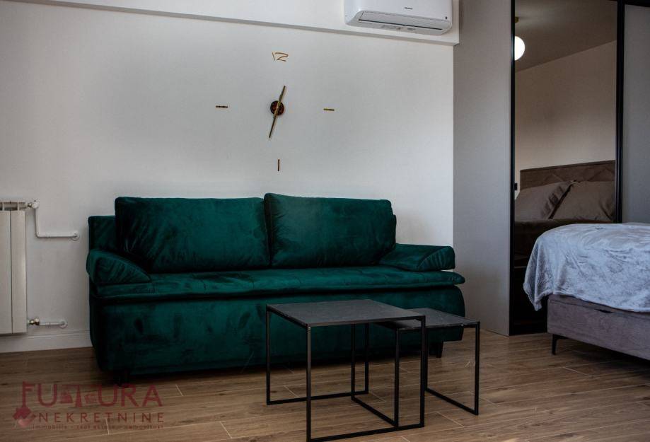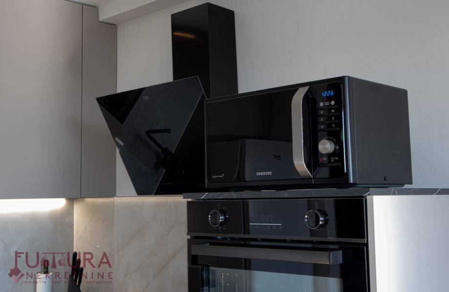 Stan je potpuno namješten i opremljen svim potrebnim uređajima za svakodnevni život – uključujući perilicu rublja, hladnjak, štednjak, TV i klima-uređaj.
