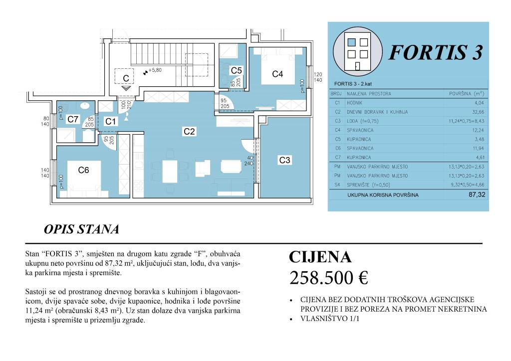 Apartment “FORTIS 3” is located on the second floor of building “F” and has a total net area of 87.32 m², including the apartment, loggia, two outdoor parking spaces, and storage.