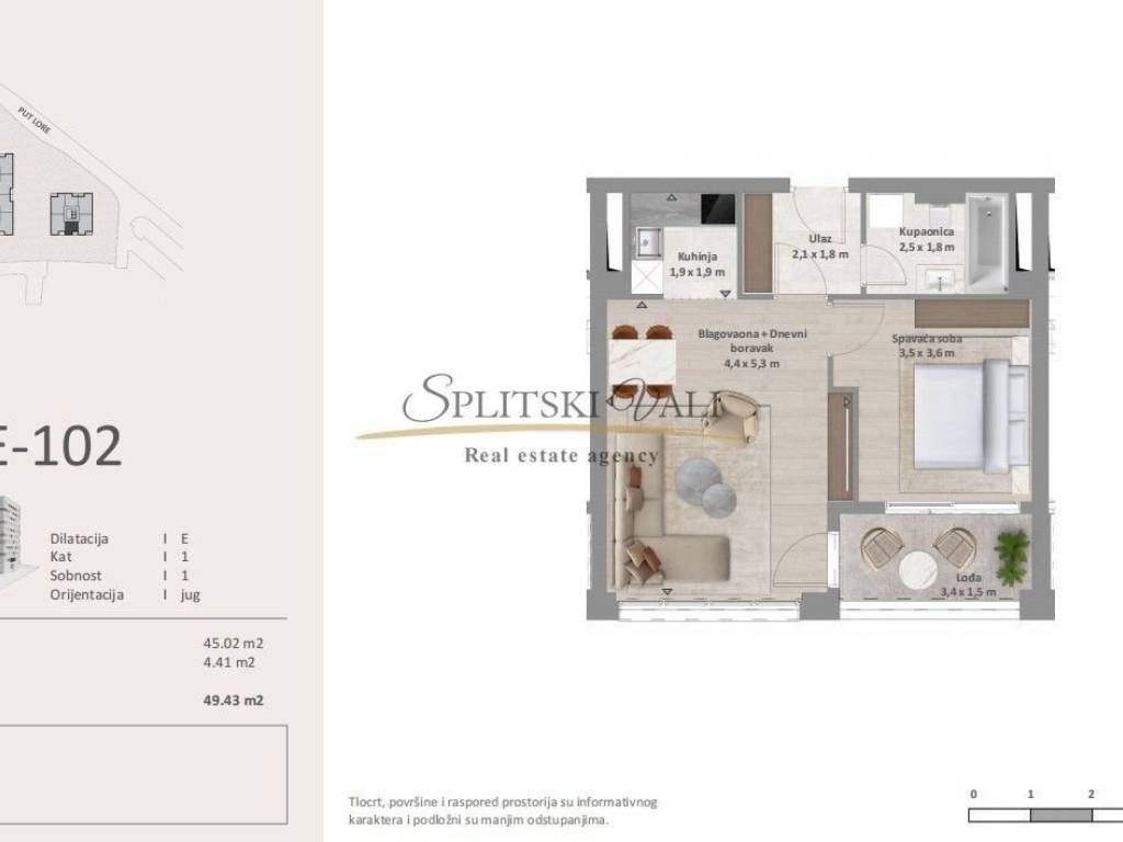 Projekt Lora - Luksuzna novogradnja u užem centru Splita.Predstavljamo Projekt L68°, ekskluzivnu gradnju smještenu u samom srcu Splita. Zgrada je osmišljena prema najvišim standardima kvalitete i udobnosti, s brojnim inovativnim rješenjima koja je izdvajaju na tržištu. Ovo je prva zgrada u Splitu s uvedenim plinskim sustavom, vodenim grijanjem i multi-split klimatizacijom, čime se osigurava maksimalna energetska učinkovitost i komfor stanovanja. Zgrade projekta Lora po standardu i dizajnu usporedive su s hotelima s pet zvjezdica. U izgradnji se koriste najkvalitetniji materijali, a svaki detalj pažljivo planiran kako bi se postigla vrhunska estetika i funkcionalnost.U sklopu projekta bit će recepcija i teretana namijenjene stanarima. Projekt obuhvaća više građevinskih cjelina:- Glavni neboder: dvije podzemne etaže parkirnih mjesta, suteren, prizemlje i 10 katova- Dvojna zgrada: dvije podzemne etaže parkirnih mjesta, suteren, prizemlje i 6 katova- Manji stambeni objekt: dvije podzemne etaže parkirnih mjesta, suteren, prizemlje i dva kataOvaj ambiciozni projekt donosi novi standard stanovanja u Splitu - spoj luksuza, udobnosti i vrhunske tehnologije u središtu grada.Stan E102 - jednosoban stan ukupne površine 49,43 m2, nalazi se na prvom katu od ukupno 10 katova. Stan je južne orijentacije i sastoji se od spavaće sobe, kupatila, kuhinje, dnevnog boravka s blagovaonicom i lođe. Velike staklene stijenke u stanu pružaju mnogo osvjetljenja tokom dana i predivan pogled iz samog stana. Stanu pripada i parking mjesto u garaži u iznosu od 35 000€ po svakom mjesta i sprema koja se nalazi u suterenu zgrade u iznosu od 22 000€. Razgled nekretnine moguć je isključivo uz potpisani Ugovor o posredovanju, a što je u skladu sa Zakonom o zaštiti podataka i Zakonom o posredovanju i prometu nekretninama. Kupac plaća posredničku naknadu od 2%+pdv. Za više informacija obratite se na 099 1600 416 Dino.