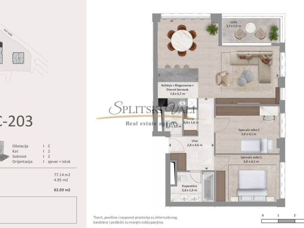 Projekt Lora - Luksuzna novogradnja u užem centru Splita. Ovo je prva zgrada u Splitu s uvedenim plinskim sustavom, vodenim grijanjem i multi-split klimatizacijom, čime se osigurava maksimalna energetska učinkovitost i komfor stanovanja. Zgrade projekta Lora po standardu i dizajnu usporedive su s hotelima s pet zvjezdica. U sklopu projekta bit će recepcija i teretana namijenjene stanarima. Projekt obuhvaća više građevinskih cjelina: - Glavni neboder: dvije podzemne etaže parkirnih mjesta, suteren, prizemlje i 10 katova- Dvojna zgrada: dvije podzemne etaže parkirnih mjesta, suteren, prizemlje i 6 katova- Manji stambeni objekt: dvije podzemne etaže parkirnih mjesta, suteren, prizemlje i dva kata.Stan C203- Dvosoban prostran stan, ukupne površine 82.09m2 smješten na 2.katu zgrade od ukupno 6. katova. Stan se sastoji od dvije spavaće sobe , kupatila, wc-a, kuhinje s blagovaonicom , dnevnog boravka i loggie. Velike staklene stijene pružaju obilje prirodnog svjetla i dodatno naglašavaju prozračnost prostora. Orijentacija stana je Sjever- Istok. Stanu pripada dva parking mjesta u garaži, po cijeni od 35.000€, te mogućnost kupnje spreme koja se nalazi u suterenu zgrade po cijeni od 22.000€.Razgled nekretnine moguć je isključivo uz potpisani Ugovor o posredovanju, a što je u skladu sa Zakonom o zaštiti podataka i Zakonom o posredovanju i prometu nekretninama. Kupac plaća posredničku naknadu od 2%+pdv. Za više informacija obratite se na broj 0991600441 Antonija