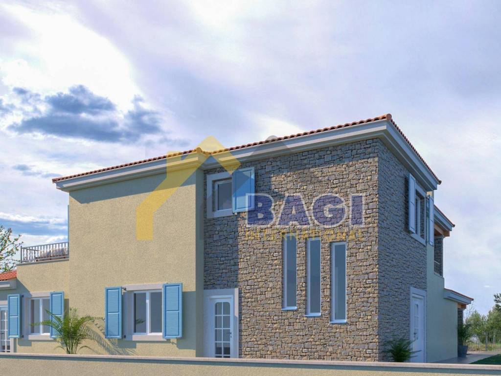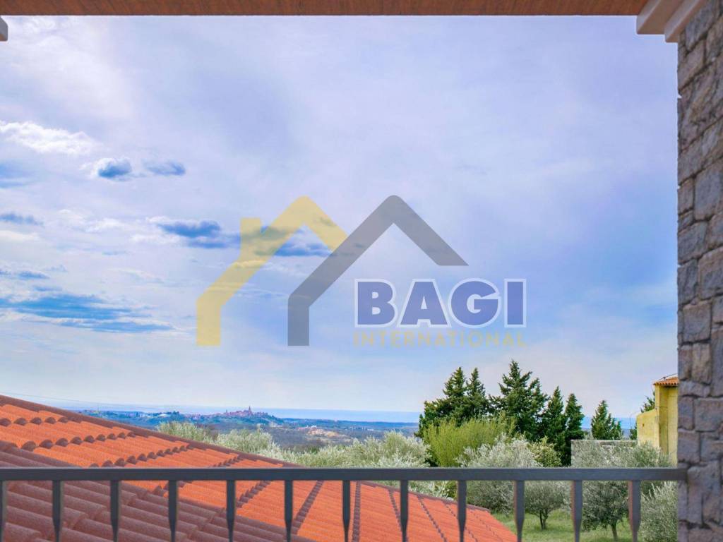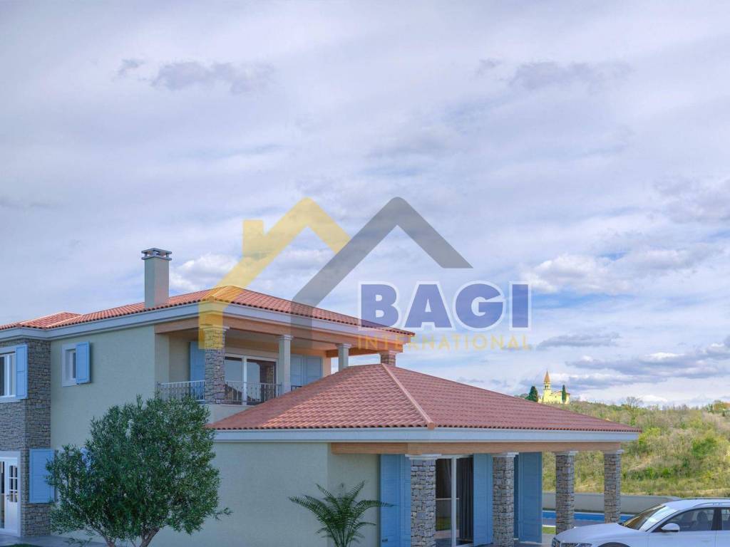 A villa under construction in Momjan is for sale. Completion is scheduled for early 2023. The area of ​​the land on which it is located is 670 m2 and the gross living area is 310 m2. The ground floor consists of a main entrance with an entrance hall and auxiliary toilet, living room, kitchen and dining room, bedroom with bathroom, summer kitchen, pool engine room and technology room. On the first floor there is a staircase with a hallway, two bedrooms each with a bathroom and an outdoor terrace overlooking the sea.