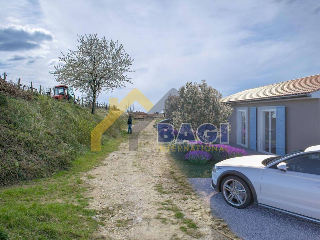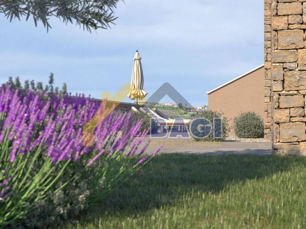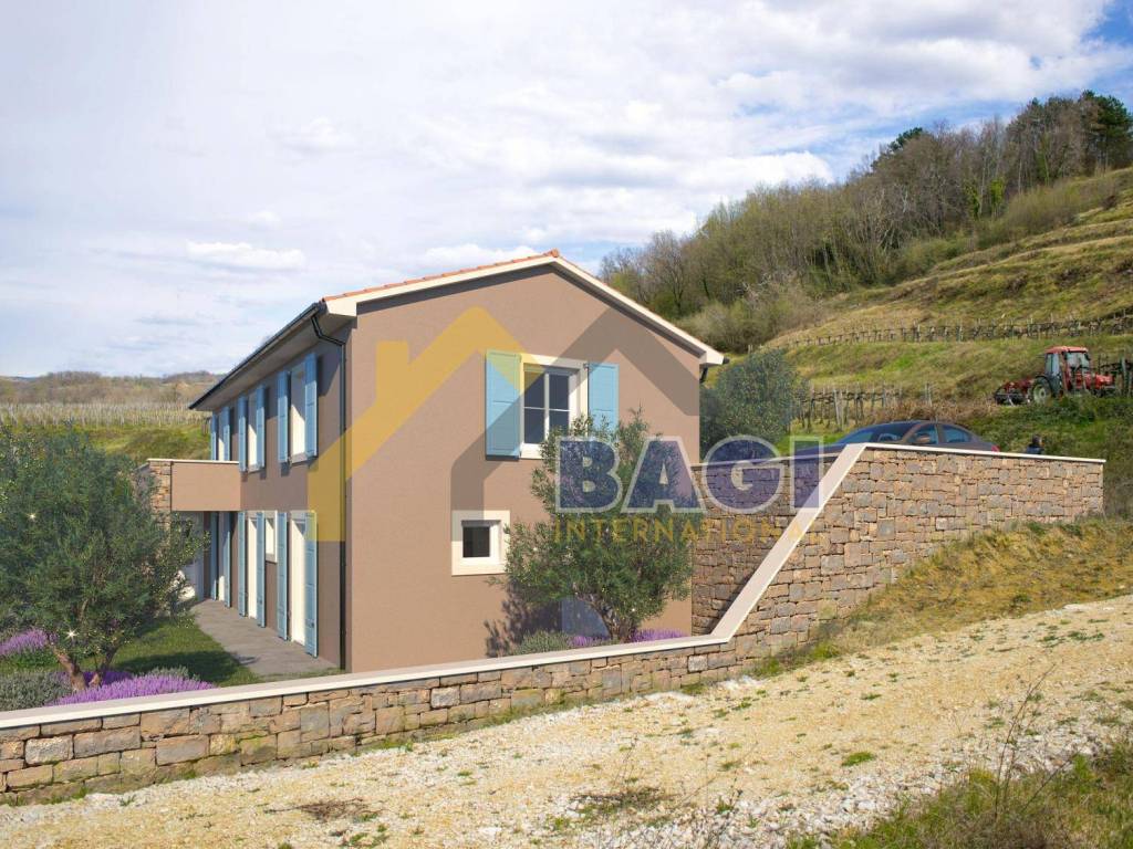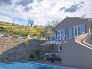 For sale is a building under construction of 180m2 in Momjan. It is located in a natural in a quiet environment and with a beautiful view. The ground floor has a main entrance with entrance hall, auxiliary toilet, kitchen and dining room, living room and covered terrace. On the first floor there are three bedrooms, each with a bathroom and a balcony, and a laundry room. The environment consists of three parking spaces, a grassy area with automatic irrigation, a swimming pool measuring 10x3.80 and a covered summer kitchen.