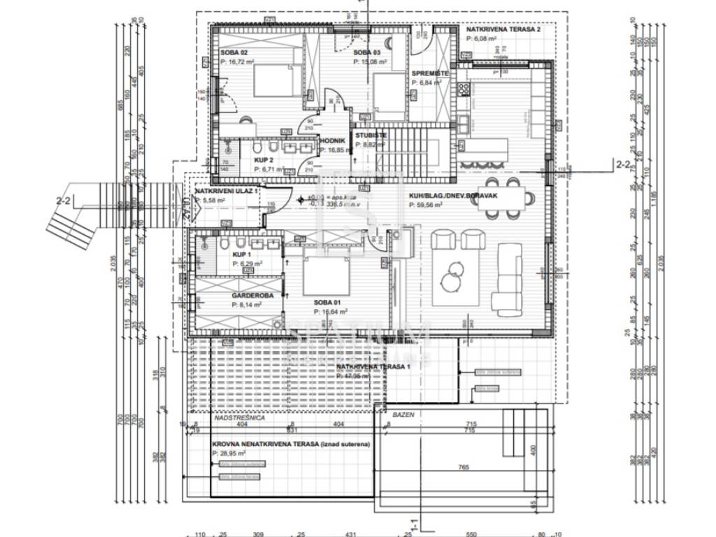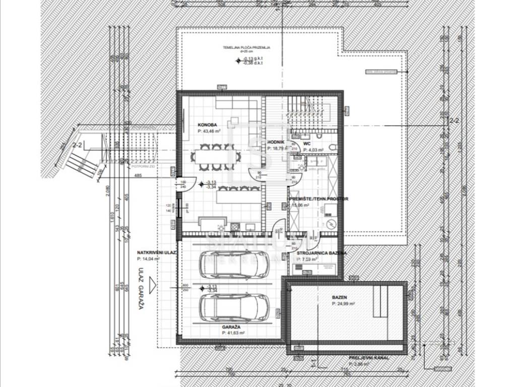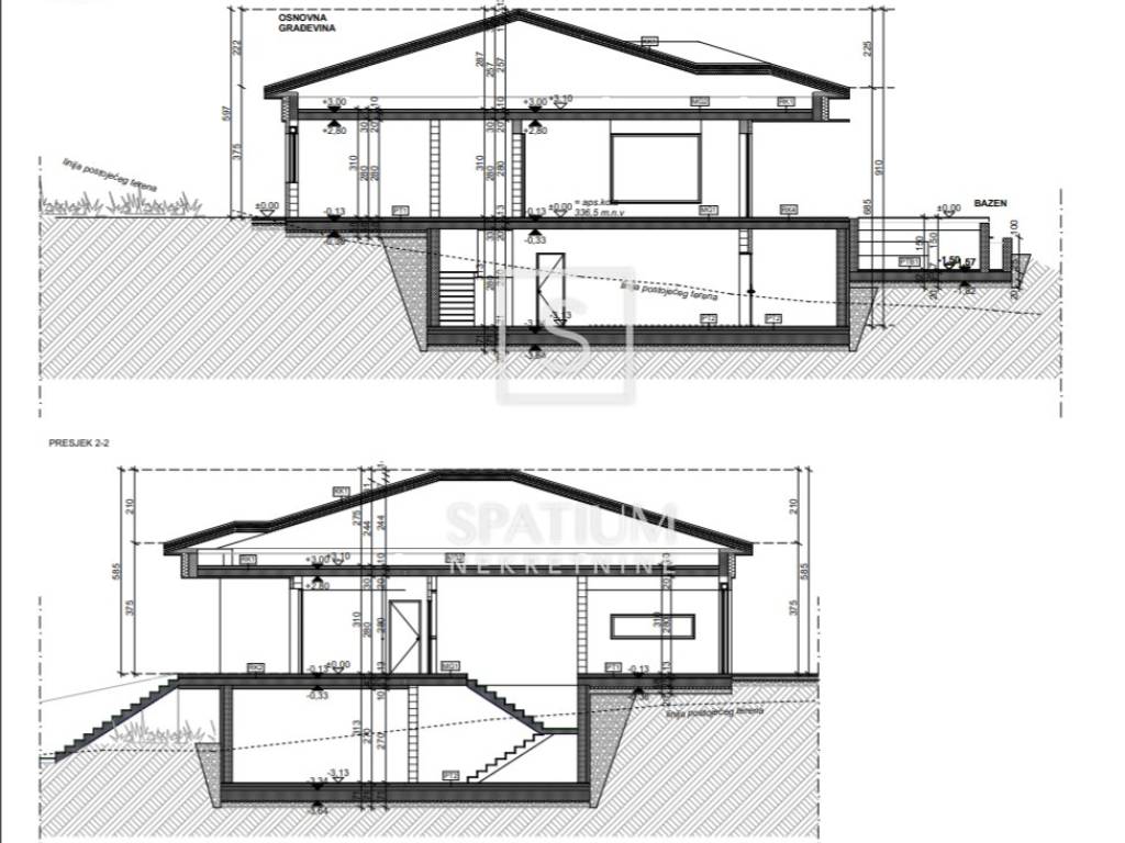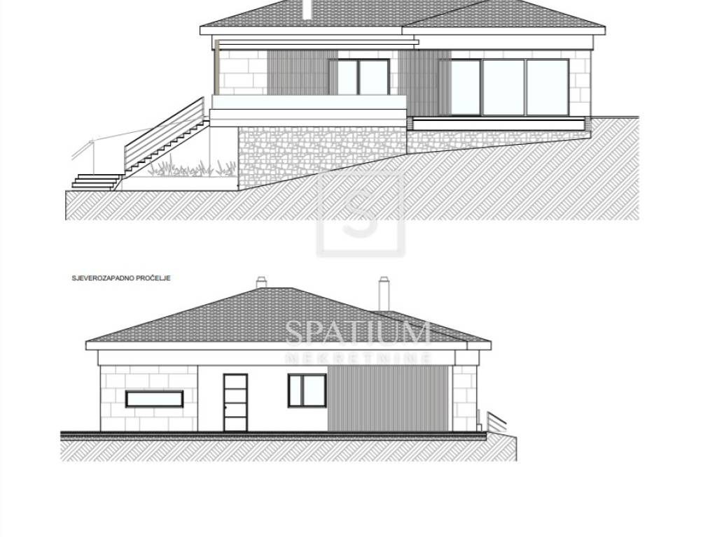 HRELJIN, u ponudu smo dobili građevinsko zemljište površine 1265m2 s prekrasnim pogledom na more, na kojem je predviđena gradnja obiteljske kuće s bazenom bruto površine 346,86m2. Po projektu, kuća se sastoji od tri spavaće sobe, garderobe, dnevnog boravka, kuhinje i blagovaonice, dvije kupaonice, toaleta, spremišta, konobe, terase i kotlovnice. Velika prednost ovog zemljišta je prije svega njegova jedinstvena lokacija te ishodovana građevinska dozvola s plaćenim komunalnim doprinosima što omogućuje budućem vlasniku da odmah krene u gradnju ove moderne kuće.