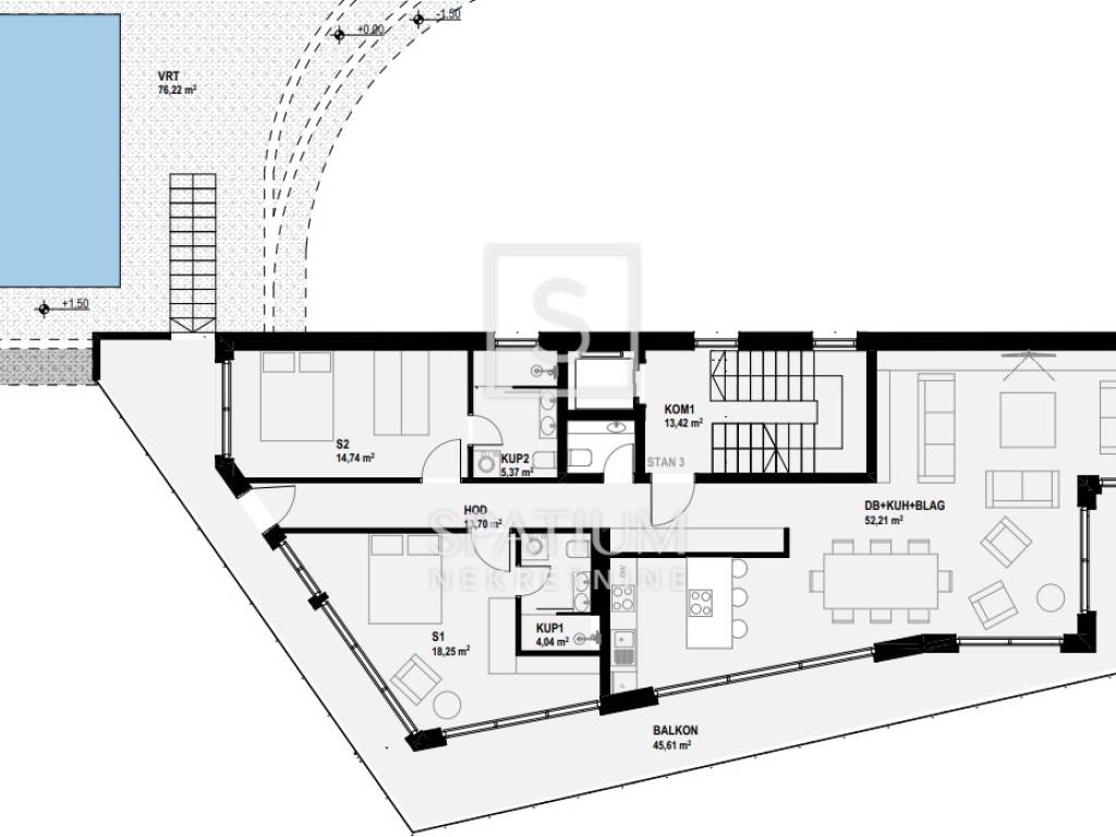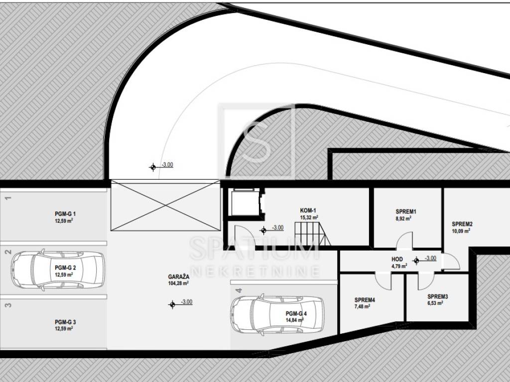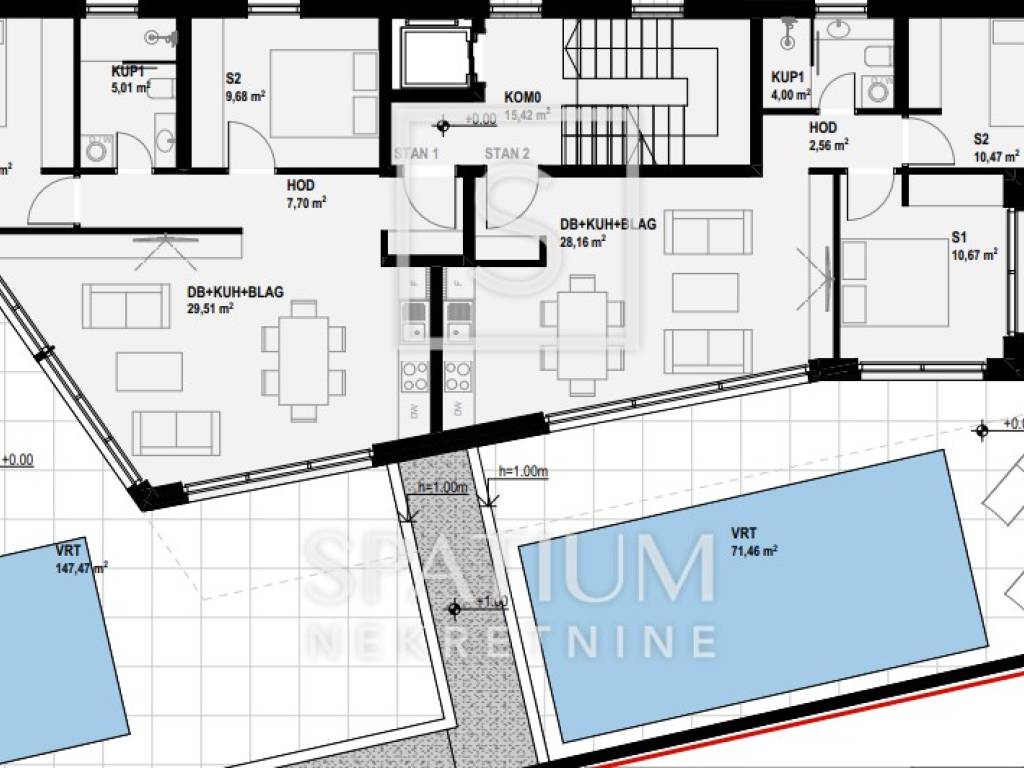 Odličan projekt predviđa podrumsku garažu za četiri automobila te četiri spremišta iz koje bi lift vodio na ostale etaže, dva stana u prizemlju i stan na katu s okućnicom i bazenima te drugi kat gdje je predviđen stan s terasom. Sveukupna je netto kvadratura 513,47 m2.