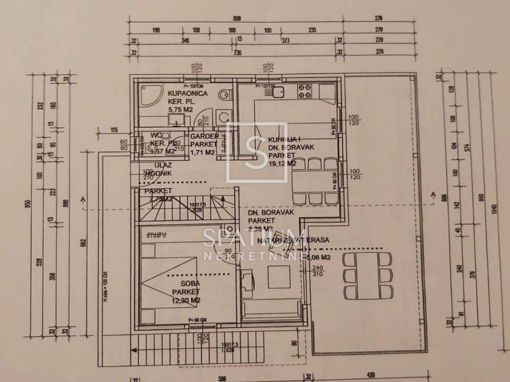 Površine je 1396m2, te je napravljen projekt za obiteljsku kuću koja se sastoji od podruma, prizemlja i 1. kata tlocrtne površine cca 80m2.