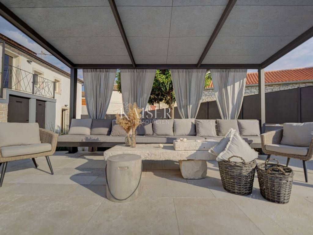 Kaiser Immobilien puts on the market a stone villa with a pool of 137 m2, located in a small settlement near Sv. Lovreč, built in 1920 and thoroughly renovated in 2017. The house consists of a ground floor of 72.7 m2 and a first floor of 63.95 m2. Communication between floors is made possible by a metal internal staircase. Massive load-bearing walls are built of stone. The mezzanine structure is made of reinforced concrete. A wooden roof structure was installed. The roof is pitched, covered with tiles. The skimmer-type concrete pool is covered with a 32 m2 foil. On the ground floor there is a living room with a kitchen and a dining room, a bedroom with a bathroom, a toilet, a summer kitchen and a boiler room. On the 1st floor there are two bedrooms with bathrooms and a terrace. The house is oriented to the southwest. For heating and cooling purposes, Midea air conditioners (4x), electric underfloor heating in the bathrooms, solar panels for hot water heating and an electric water heater for heating domestic hot water 300 l have been installed. The house is sold fully furnished, and the new buyer only needs to bring personal belongings. During the summer season, the house is rented to tourists. The price of the house includes solid wood furniture, bathroom furniture and outdoor furniture. The total area of the land with the yard is 335 m2. There is a parking lot with two parking spaces inside the yard. It is up to you to call the agent and arrange a viewing of the property.