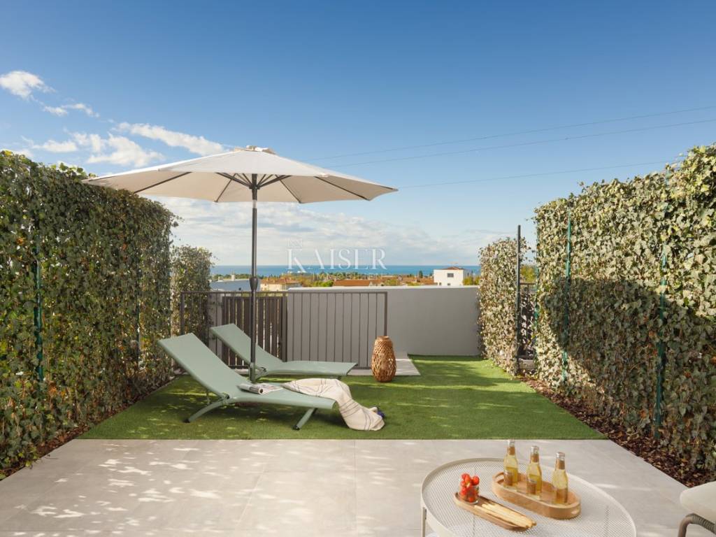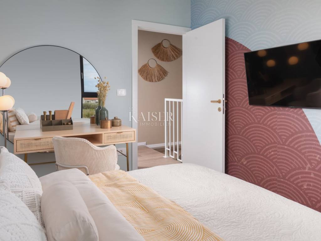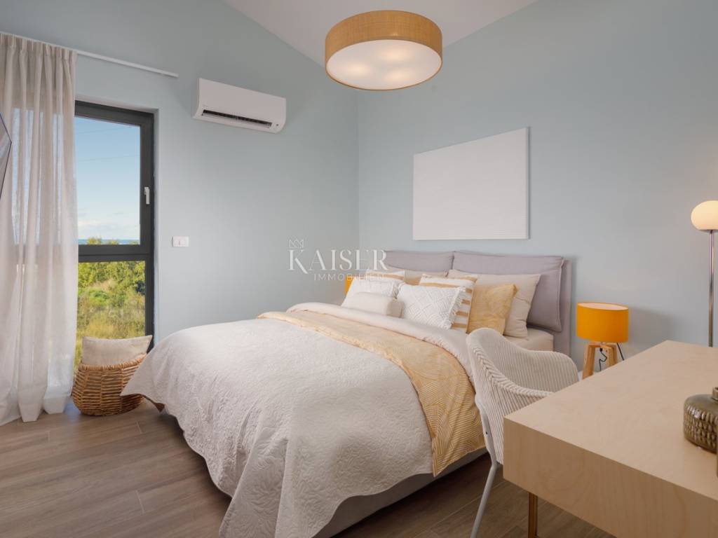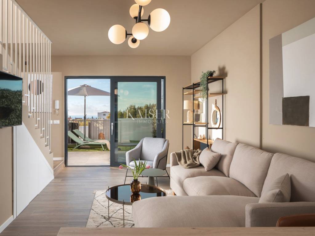 Kaiser Immobilien presents a modern, smart project of terraced houses with a sea view and only 950 m from the sea and 2 km from the center of Poreč. The house is located near all necessary facilities for life, in a great location with a great environment. The house is connected, in a row, but due to a good architectural project and excellent organization of space and privacy, the house has everything you need for your new, peaceful, pleasant life in a great location. The space of the house is designed very modern and contemporary on two floors. On the ground floor of the house there is a living room and a kitchen, a guest toilet and a staircase. Thanks to the modern architecture, the space of the house is very well organized with a lot of light coming through the glass walls and open space. Climbing the stairs where we reach the first floor of the house, we find two bedrooms that share one bathroom, a hallway and a modern gallery for relaxation. The house has its own garden, which extends in front and behind the house, also modernly decorated, measuring 43.41 square meters. The organization of the space is designed so that you can enjoy your complete privacy and perfect ambience. This modern and fully furnished house has two parking spaces. The house is heated with an air conditioning system. Distance of the property to the city: Poreč - Pula Airport, 45 km Poreč - Ljubljana, 162 km Poreč - Vienna, 544 km Poreč - Prague, 868 km Poreč - Munich, 565 km If you want this new, modern house to become your new home. , contact the agent at phone number 00385 923782803, or at the email address: ivana@kaiser-immobilien.hr. Agency commission is 3% + VAT.