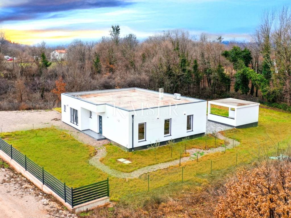 Kaiser Immobilien presents a unique opportunity to purchase a new building with a swimming pool near the sea. The house is located in the municipality of Kršan, just a ten-minute drive from the first beaches and promenades. It consists of 137 m2 of living space, an auxiliary building of 20 m2 (the building's area is not included in the area of the living space) and is located on a plot of 1,450 m2. This modern new building is characterized by clean lines and large glass surfaces that allow plenty of natural light and provide a beautiful view of the surrounding nature of the area. It consists of an open space intended for a kitchen with an island, a dining room and a living room. The space provides direct access to the pool sundeck. Heating and cooling is provided by an air conditioning unit and there is also preparation for a fireplace. It also offers a toilet and a storage room. It provides three bedrooms with private bathrooms, the bathrooms are of modern design and are equipped with all necessary sanitary facilities, while the rooms have preparations for air conditioning and TV. Two bedrooms provide access to a covered terrace and a pool sundeck. The yard is spacious, decorated with attention to detail and offers a swimming pool with an auxiliary building for a summer kitchen. It offers parking spaces for several cars and is completely fenced. The property is located in a quiet location, surrounded by nature and amenities such as shops, cafes and restaurants are only a 10-minute drive away. For more information, contact the agent. Ana Beović ana@kaiser-immobilien.hr +385 91 618 3332