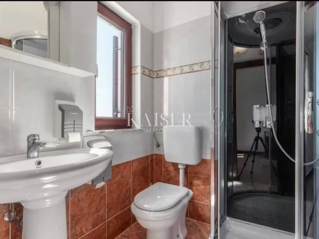 The house extends over two floors, a ground floor of 96.51 m2 and an upper floor of 96 m2, offering a total of four spacious bedrooms. The ground floor begins with a 5.43 m2 entrance hall, which leads to the right into a spacious open-concept living room, connected to a fully equipped kitchen and dining room of 47.34 m2. The living room is adorned with an authentic stone fireplace, made in the style of an Istrian kažun, with uniquely carved stone in the shape of Istria. The kitchen is equipped with a gas stove and one electric hob, while behind it there is a separate toilet of 2.87 m2. Straight from the entrance is the first bedroom of 11.47 m2, which has its own bathroom of 4.22 m2 with a shower and toilet. An elegant internal marble staircase leads to the first floor, where there is a hall of 15.93 m2. Directly in front of the staircase is a closed terrace of 18.60 m2, which can also be used as an additional bedroom. On the first floor there are three more comfortable bedrooms, each with its own bathroom. The first bedroom of 14.04 m2 is equipped with solid wooden furniture and has a bathroom of 4.04 m2 with a toilet and shower. The largest bedroom of 16.63 m2 also has an en-suite bathroom of 4.01 m2, while the fourth bedroom of 15.61 m2 comes with a spacious bathroom of 7.14 m2. All rooms and common areas are equipped with air conditioners from renowned brands Midea, GreenTech and TLC. The windows are PVC with double-glazed wood-like glass, which provides additional thermal and sound insulation. A special feature of this property is a large swimming pool measuring 10x5 m, with a depth of 1.30 m to 1.50 m. The pool uses salt water and has preparation for heating via solar panels. In addition, the property includes a spacious 30 m2 tavern with a functional summer kitchen, a built-in barbecue and an additional bathroom. Below the tavern is a 20 m2 basement, tiled with ceramics and equipped with as many as seven sockets, which allows it to be adapted into a wellness area, hobby room or additional storage space. The 400m2 plot is fully fenced, and the garden is enhanced by an automatic irrigation system and planted with two cherry trees and one olive tree. An outdoor shower and a cistern for collecting rainwater are additional elements that contribute to the practicality and ecological sustainability of the home. The house uses a septic tank instead of the city sewer. There are even connections for cameras in every corner of the house.