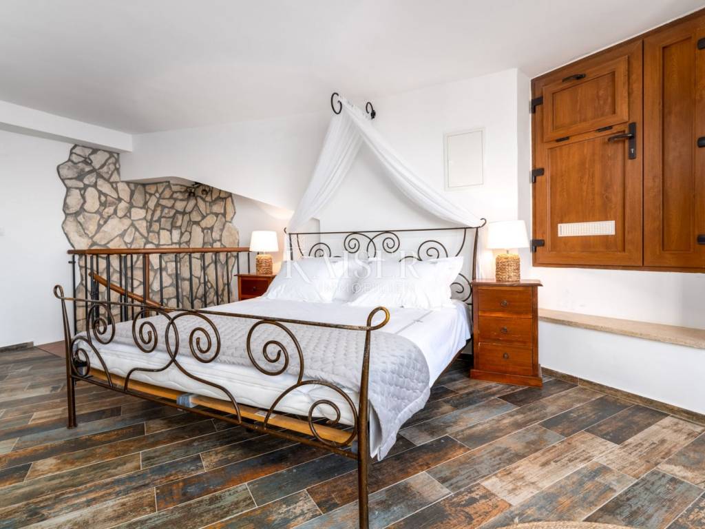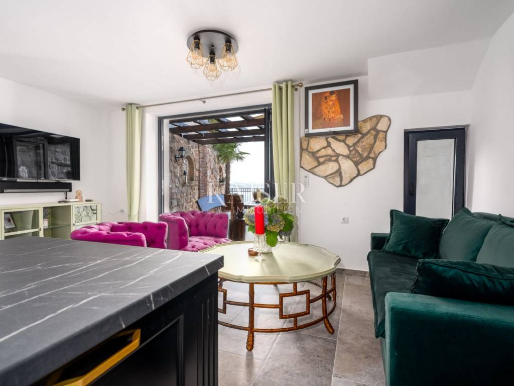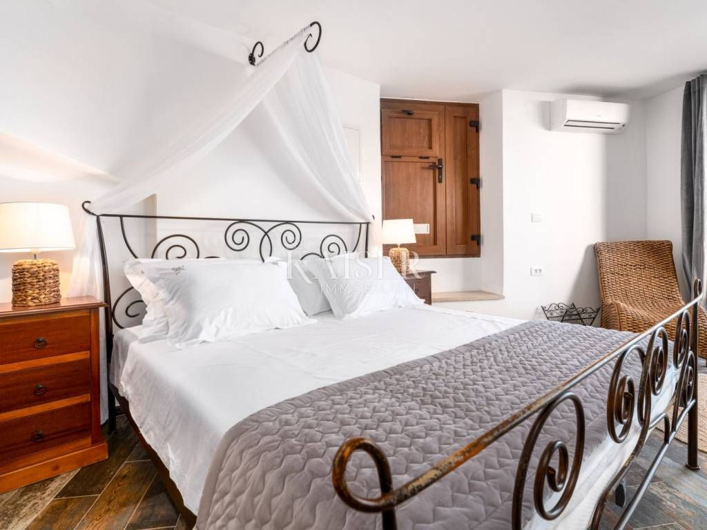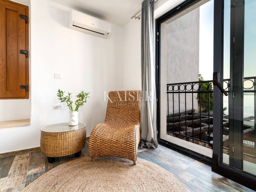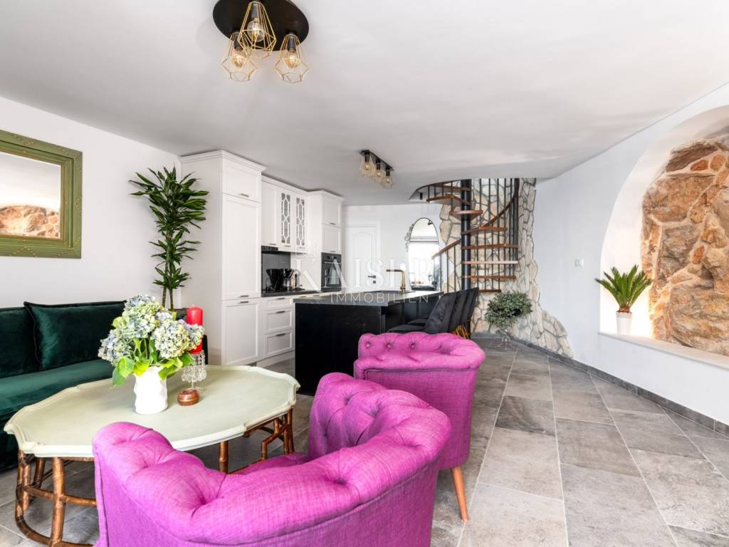 Stop for a moment and try to imagine the house by the sea from your dreams. Waking up to the scents and sounds of the sea, the summer breeze, panoramic views from every floor, Mediterranean design and top-notch amenities are just some of the things this exceptional property we have on offer offers. Kaiser immobilien mediates in the sale of real estate in an irresistible location - a cliff above the sea, in the old town of Vrbnik on the island of Krk. Vrbnik is located on the eastern side of the island of Krk, perched on a cliff that rises steeply 50 meters above the sea. It is a small town that emerges from the sea and plunges into the blue sky, and will enchant you with its old town center, historical heritage, beaches of exceptional clarity, the flavors of wine and authentic Krk dishes, and unique viewpoints. Vrbnik was first mentioned in written documents on January 1, 1100, currently has about 900 inhabitants, and is the right choice for anyone who does not want mass tourism, but is looking for authentic Mediterranean charm. The house, with a total area of 99m2, extends over three floors. On the ground floor there is an open-concept living area of 30m2, which includes a kitchen, dining room and living room, there is also a separate toilet, and a 60m2 terrace with a sunbathing area and a hydromassage pool. Spiral stairs lead to the second floor where there is a bedroom with its own bathroom. On the third floor, which is accessed from the outside, there is another bedroom with its own bathroom. Every room in the building offers an unobstructed panoramic view of the sea and the dramatic scenery of the nearby mountains. The interior design is carefully thought out, harmoniously following the features of the Mediterranean style, a gentle color scheme in earthy shades that reminds of the connection with nature, which has always been present and important in the Mediterranean. The space is further enhanced with textures and recognizable patterns, and the fusion of timeless materials such as stone and wood with modern technology is flawlessly executed. The property was completely renovated and equipped in 2021. The renovation included all installations, all openings - carpentry, top-quality ceramic tiles, new sanitary ware, a new kitchen and other furniture. The house also has underfloor heating installed on all three floors, all rooms are air-conditioned, Lunos automatic ventilation for humidity control and regulation, and a sound system from the top manufacturer Sonos. This property is being sold fully furnished and equipped. Approximately 60m from the property there is a 40m2 owned parking space - an exceptional rarity and privilege for property owners in the old town. This property can also be used as an investment, it is categorized for tourist rental and as such achieves excellent business results. Whether you are looking for a dream property in an ideal location, or are thinking about investing, this property is definitely the right choice. The cover of all life-style magazines is guaranteed! The commission of the agency for the buyer is 3% + VAT and is paid in case of real estate purchase, when the first legal deed is concluded. ID CODE 105-288