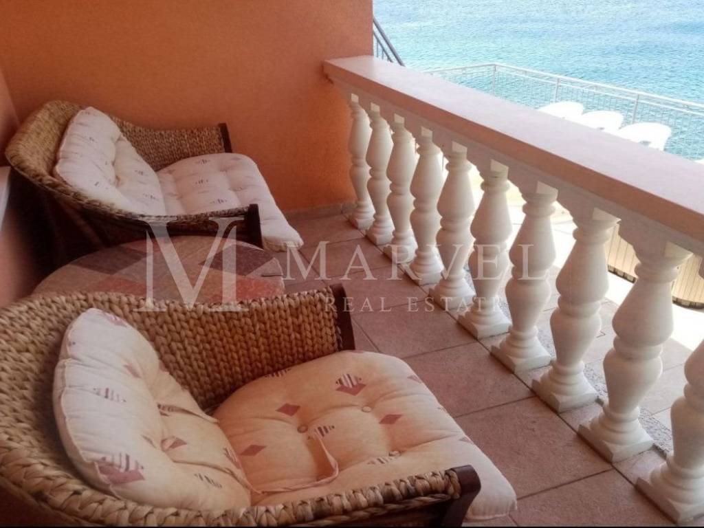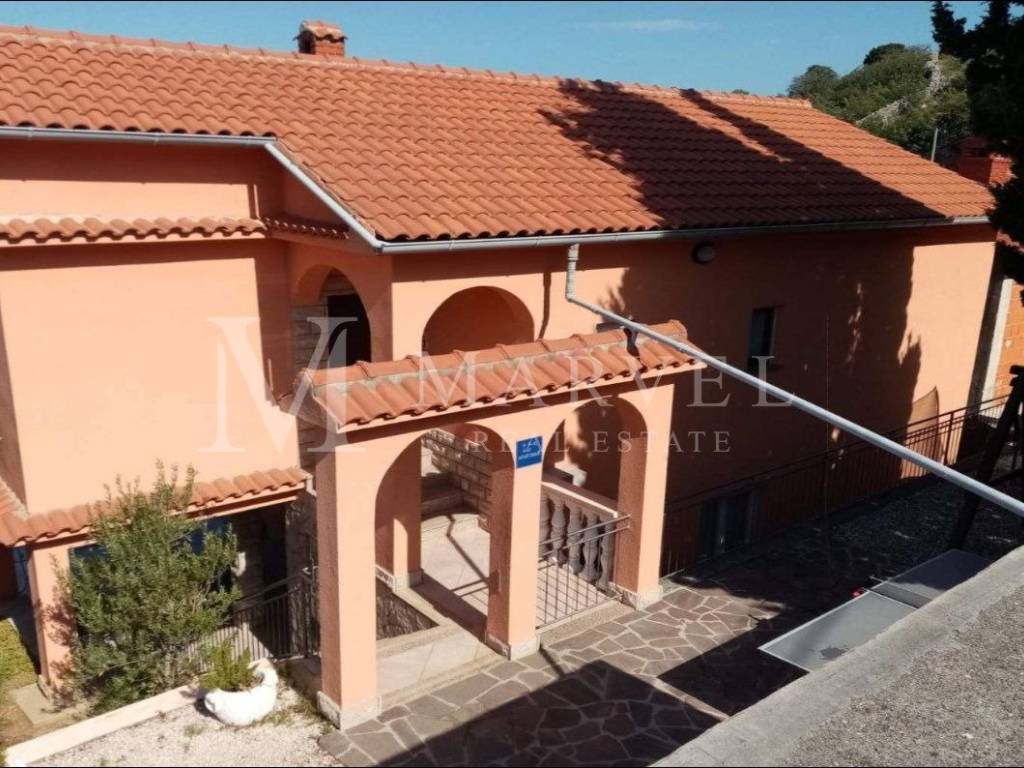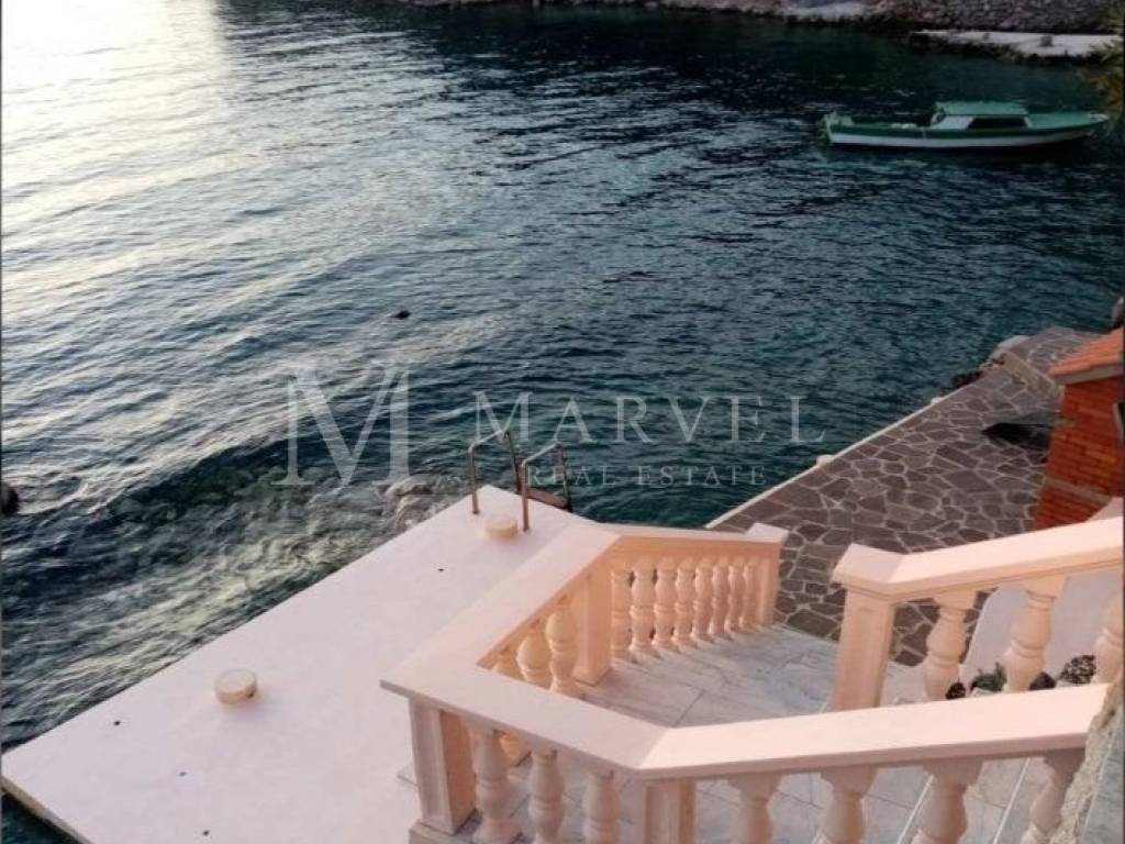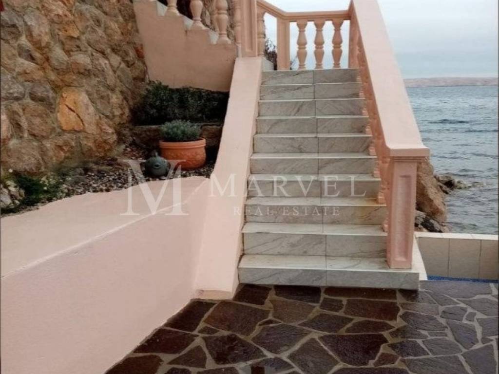 A detached house near Karlobag, located right by the sea, with a private beach and boat dock, is for sale. The house consists of two separate apartments, each with its entrance. The ground-floor apartment features 2 bedrooms, a kitchen, a living room, a bathroom, a hallway, storage, a covered terrace, and a balcony. The upper apartment includes 3 bedrooms, a kitchen, a living room, a bathroom, a hallway, storage, and a balcony.