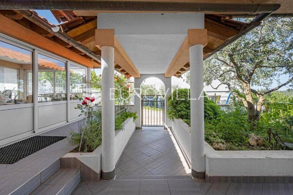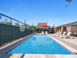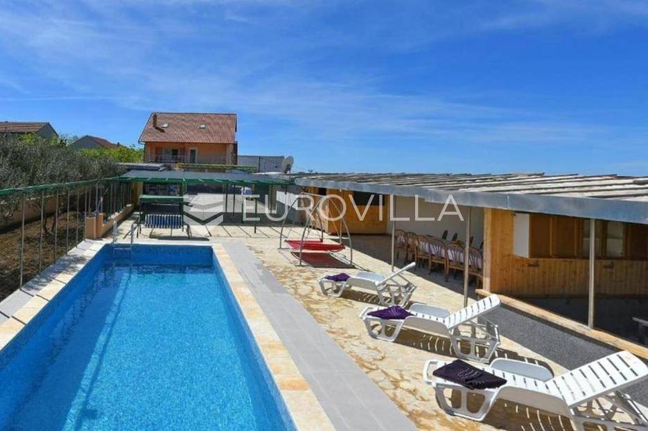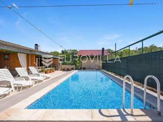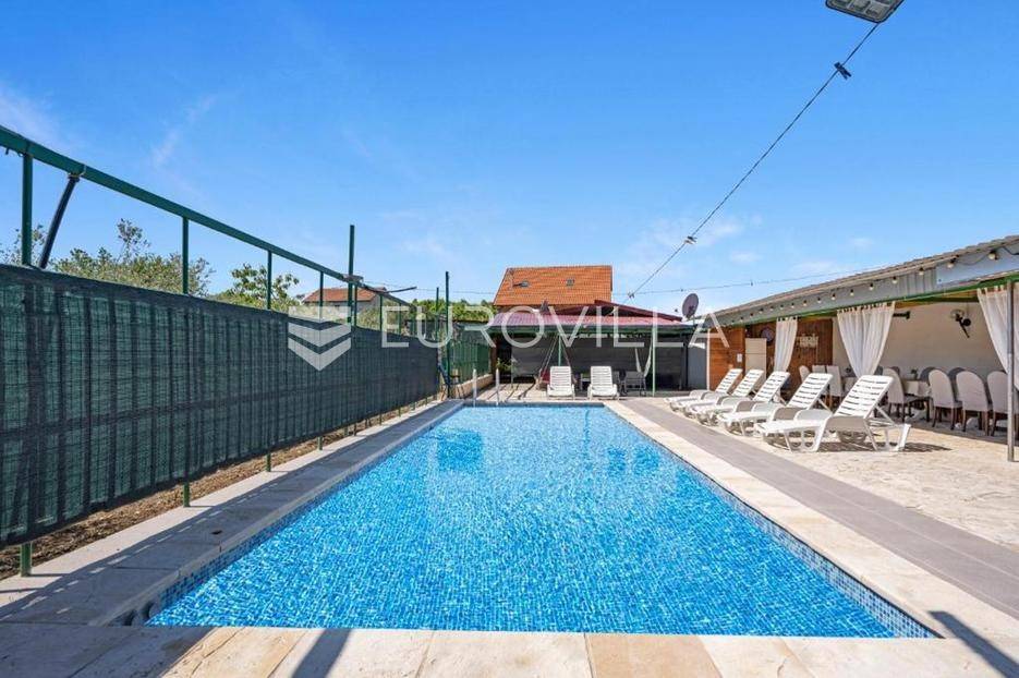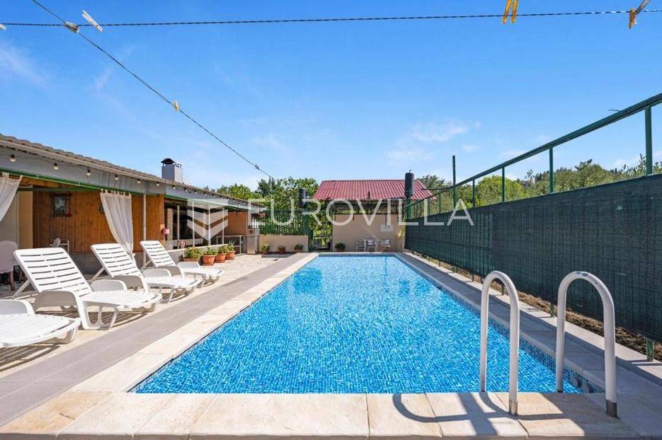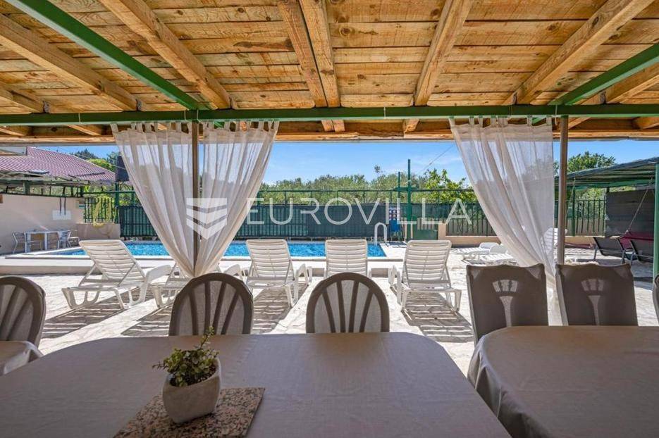 Skradin, Dubravice, kuća sa 7 apartmana i velikim bazenom, izgrađena na parceli površine 2556 m². Okružena je velikim dvorištem i maslinikom. Prodaje se potpuno namještena i opremljena, spremna za odmor ili za nastavak uspješne djelatnosti najma.Kuća uz podrum ima i 3 stambene etaže na kojima se nalazi 5 apartmana s jednom spavaćom sobom, kupaonicom i dnevnim boravkom s kuhinjom. Uz te apartmane kuća i dva velika stana po 200 m². Jedan ima 3 spavaće sobe, dvije kupaonice i dnevni boravak s kuhinjom i blagovaonicom. Drugi ima 4 spavaće sobe, dvije kupaonice i dnevni boravak s kuhinjom i blagovaonicom. Na imanju je još i dodatni pomoćni objekt za smještaj osoblja, površine 50 m².Pokraj kuće se nalazi veliki bazen sa sunčalištem uz koji je vanjska kuhinja i stol za 20 ljudi. U dvorištu je još i prostor za opuštanje sa stolom za biljar. Kuća ima 10 natkrivenih parkirnim mjesta.Kuća se nalazi na odličnoj lokaciji, u blizini Skradina i Nacionalnog parka Krka.Za sve ostale informacije stojimo vam na raspolaganju.