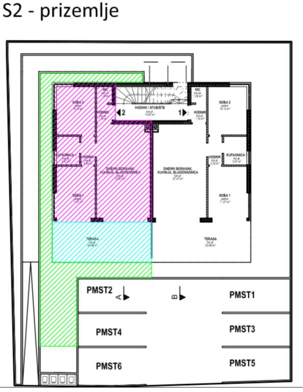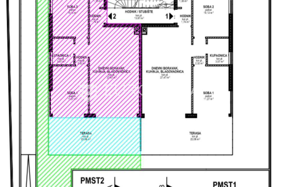 Predstavljamo vam projekt moderne novogradnje u novoizgrađenom dijelu Povljane na otoku Pagu. Zgrada se sastoji od ukupno 6 stambenih jedinica raspoređenih na 3 etaže. Udaljena je svega 300 metara od mora, lokalnih plaža i ostalih sadržaja potrebnih za kvalitetan život ili odmor.Stan S2 / 72,91m2 / PrizemljeStan S2 se nalazi u prizemlju zgrade te je ukupne neto korisne površine 72,91m2. Sastoji se od otvorenog prostora kuhinje, blagavonice i dnevnog boravka (27,47m2), hodnika (4,06m2), spavaće sobe 1 (11,27m2), spavaće sobe 2 (10,12m2), kupaonice (3,57m2), WC-a (1,38m2) te natkrivene terase (22,08m2). Stanu uz to pripada i prostran vrt (40m2) i vanjsko parkirno mjesto.Zgrada je građena i opremana kvalitetnim materijalima i opremom od čega valja izdvojitiMultisplit sustav klima marke Gree u svim spavaćim sobama i dnevnim boravcima, podno grijanje u kupaonicamaVrhunska troslojna low-E vanjska PVC stolarija s električnim aluminijskim roletama i komarnicimaProtuprovalna i protupožarna vrataVanjska izolacija od mineralne vune (10cm)Parkirna mjesta s priključkom za strujuI još mnogo togaPDV je uključen u cijenu te kupac ne plaća porez na promet nekretninama!Očekivano useljenje je 03/2026. Zgrada je trenutno u fazi završnih radova.Povljana na otoku Pagu je idilično ribarsko mjesto koje osigurava autentično iskustvo dalmatinskog načina života. Prostrane plaže i bistrano more čine je omiljenom destinacijom za opuštanje i uživanje u prirodi. Mjesto odiše šarmom, s bogatom poviješću, kulturnim događajima i ukusnom lokalnom gastronomijom koja zadovoljava sve posjetitelje. Obratite nam se za više informacija te za dogovor o razgledavanju nekretnine.