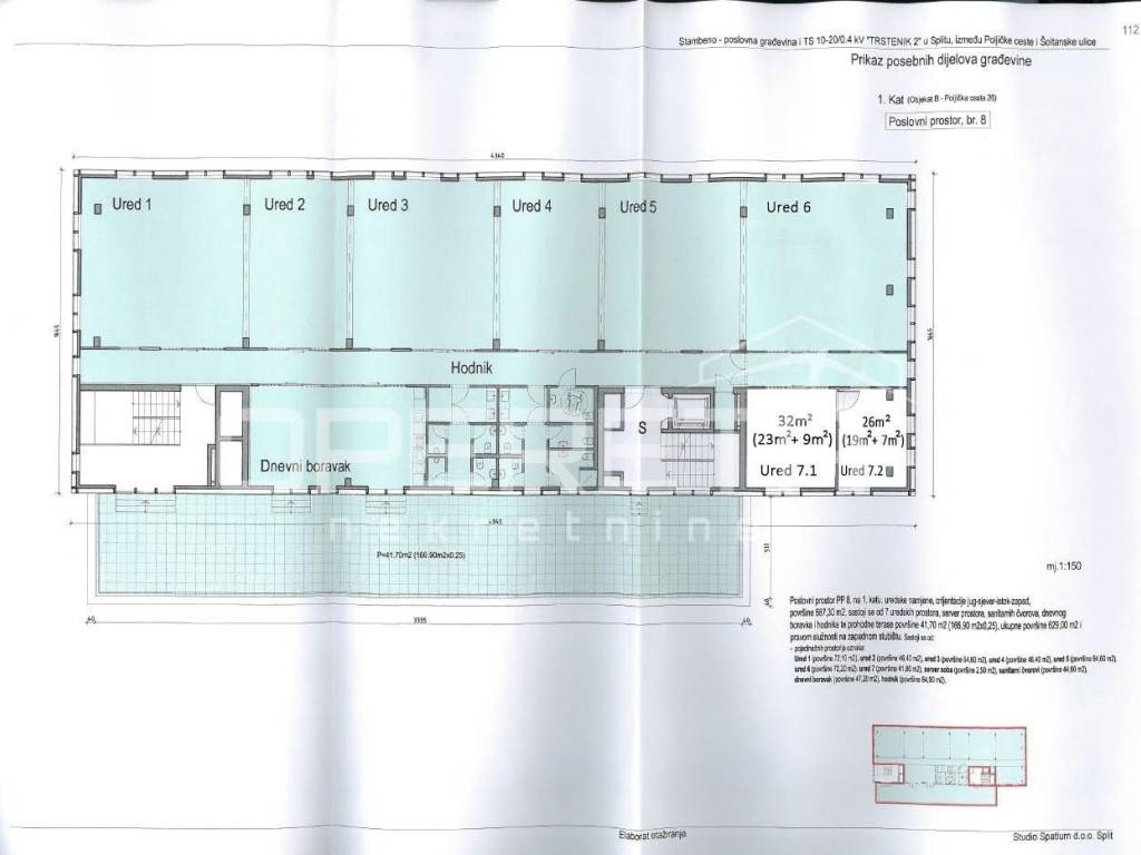 Prvi prostor (ured 7.1) površine 32,00 m² sastoji se od 23,00 m² uredske površine i 9,00 m² zajedničkih prostorija, dok drugi prostor (ured 7.2) površine 26,00 m² uključuje 19,00 m² uredskog dijela i 7,00 m² zajedničkih prostorija.