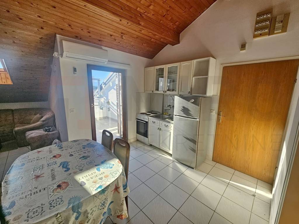 The island of Krk, Malinska offers a furnished apartment located in a smaller residential building, close to the sea and the center of Malinska. This beautiful apartment is located in a high attic. It consists of an entrance hall, 2 bedrooms, bathroom, living room, kitchen and dining room with access to a balcony with a sea view. The apartment has the possibility of parking in the building's yard, but the parking lot is not owned. The apartment is furnished and ready to move in. It is located in a quiet location only 400 m from the beach. The documentation is in order, the ownership is clear, and the buyer bears the real estate tax of 3%. Visit us and find the square footage of your home!