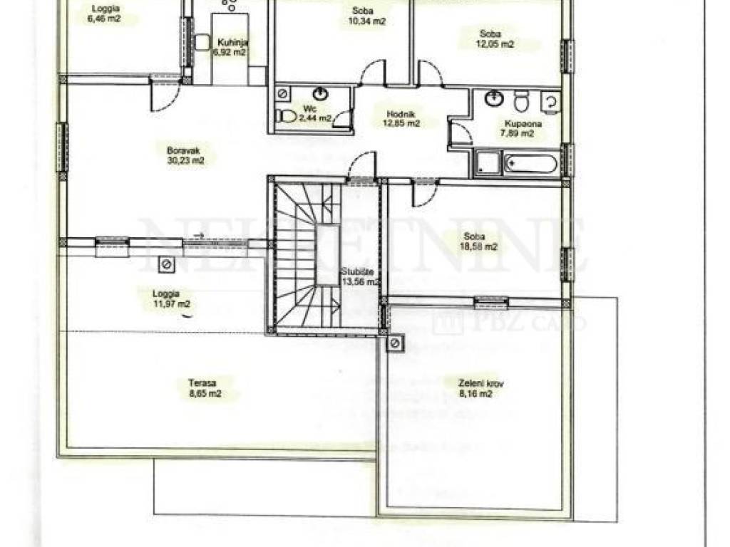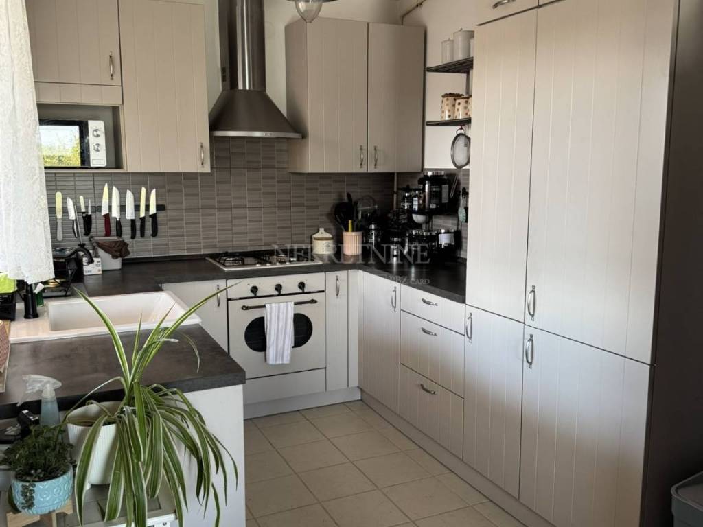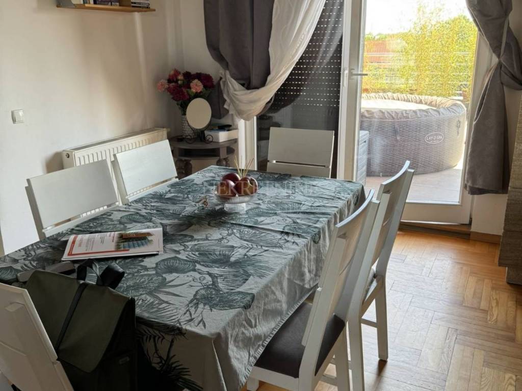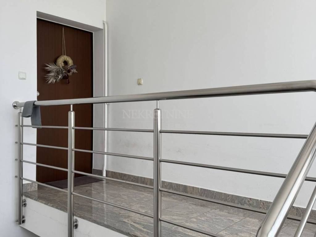 Stan se satoji od hodnika, dnevnog boravka,kuhinje, logge, kupaonice, WC-a, 3 spavaće sobe, terase i zelenog vrta u produžetku terase.