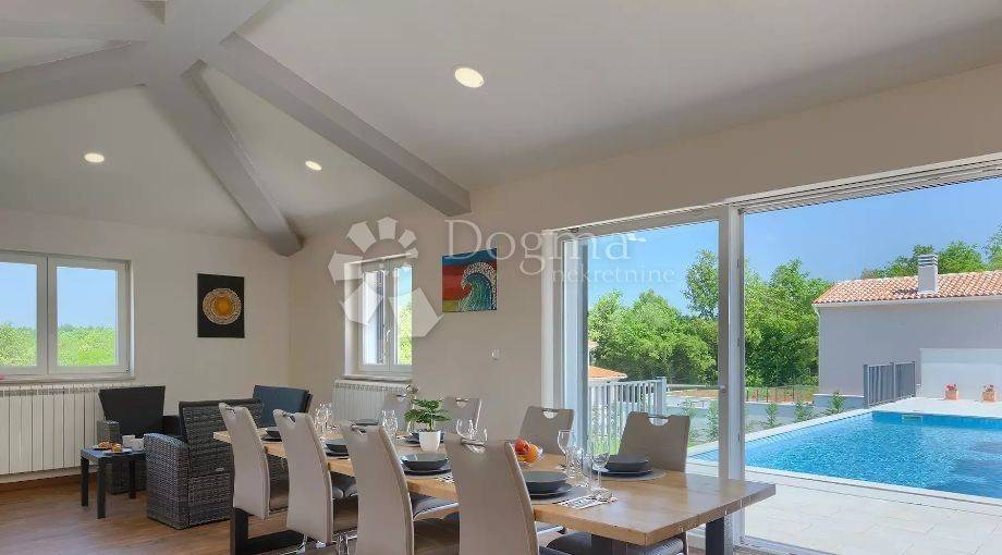 VILLA WITH SWIMMING POOL NEAR LABIN This beautiful villa with a pool near Labin is for sale. It consists of a ground floor and a first floor with a total area of 249 m2. On the ground floor there is an open space kitchen with dining room and living room, two bedrooms with their own bathrooms and another bathroom. On the ground floor there is also a separate room with a barbecue, a dining area and a fully equipped kitchen for spending time with loved ones. There are two more rooms with bathrooms on the first floor. Each bedroom has air conditioning and a TV. All rooms in the house have laminate, except for the bathrooms where there are tiles. Pellet central heating has been installed throughout the house, and in addition to the bedrooms, air conditioning is also found in the living room and in the additional room. PVC carpentry was installed on the house. There is a 38 m2 swimming pool, a lounge set and deckchairs for relaxing, and table tennis on the spacious landscaped garden. The house has an irrigation system: 249 m2 1406 m2 GARDEN P+1 4 BEDROOMS 5 BATHROOMS SPECIAL ROOM WITH BARBECUE AND KITCHEN CENTRAL HEATING ON PELLETS 6 AIR CONDITIONING DEVICES SWIMMING POOL 38 m2 IRRIGATION SYSTEM SEPTIC PVC DOORS AND WINDOWS FACADE Styrofoam 10 CM STONE WOOL INSULATION FOR SALE FURNISHED OWNERSHIP 1/1 Please feel free to contact us for any additional information NICOL DOBRIĆ 00385 91 768 70 29 nicol.dobric@dogma-nekretnine.com MEDIATION ASSISTANT ID CODE: IS1518849 Lorena Kogej Agent s licencom Mob: 091/738-7200 Tel: 052/639-276 E-mail: lorena.kogej@dogma-nekretnine.com www.dogma-nekretnine.com