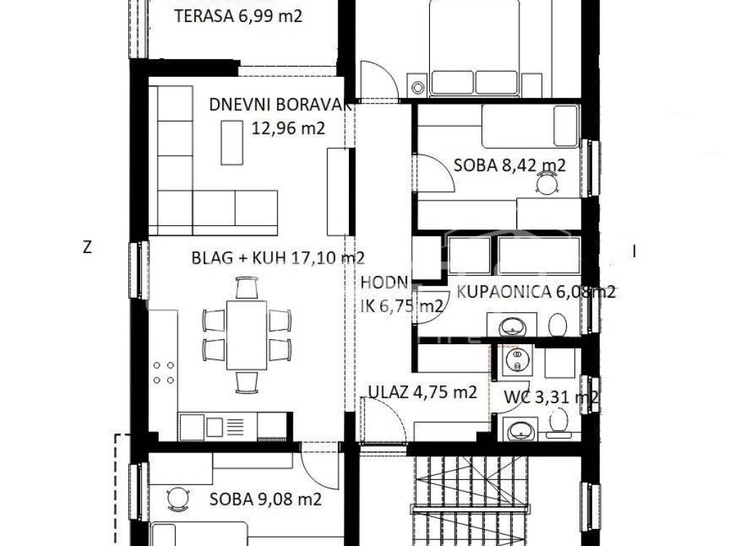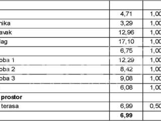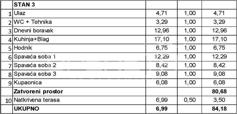 1. Stan površine 80.68 m2, natkrivena terasa površine 6.99 m2 i privatna garaža s 2 parkirna mjesta površine 33.64 m2 u razini prizemlja (prema izračunu s koeficijentima stan, terasa i garaža imaju ukupno 101.00 m2).