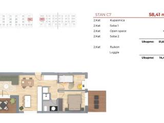 The apartment is situated on the second floor of the residential building and consists of an entrance hall, an open-plan area with a kitchen, dining room, and living room with access to a loggia. There are two bedrooms, one of which has access to a private balcony, a modern bathroom, and two parking spaces included in the price.