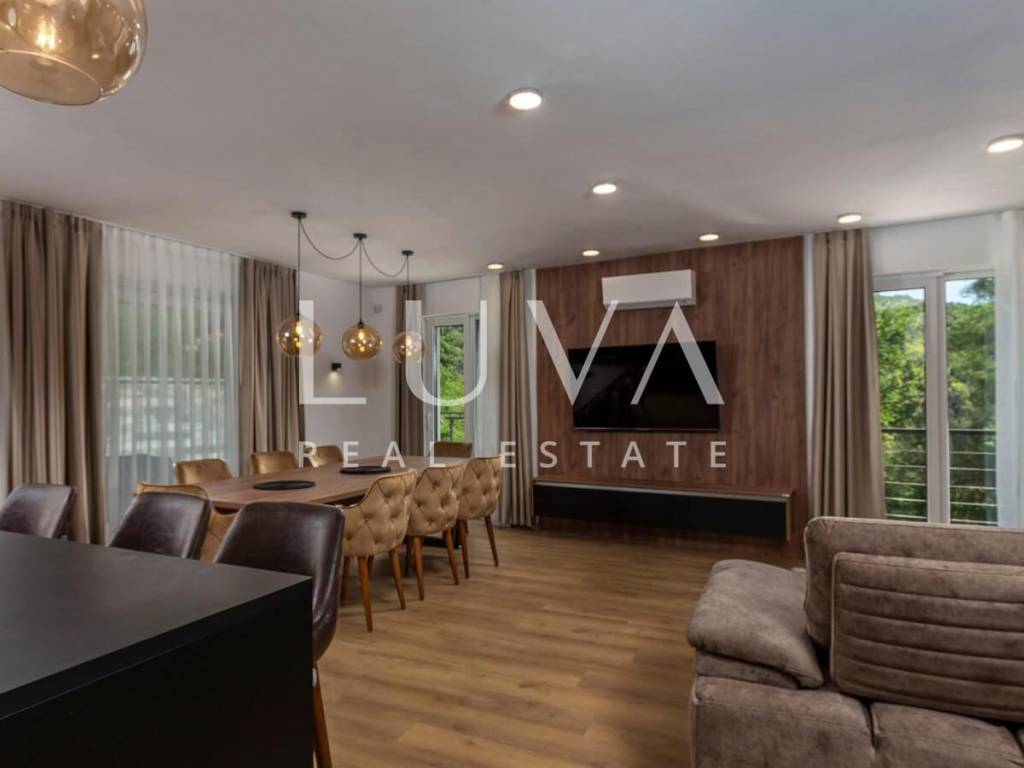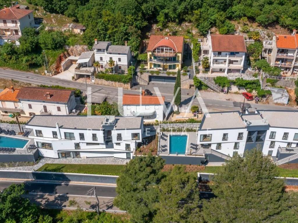 A luxury house with a pool for sale in Mošćenička Draga, near Opatija. This modern luxury house was built in 2022 and is located very close to the sea. It has 250 m² spread over 3 floors. The villa features a spacious living room, a fully equipped kitchen, 3 bedrooms, 4 bathrooms, and a wellness room with a sauna and Jacuzzi. The entire property is fully fenced and has parking for 3 cars.