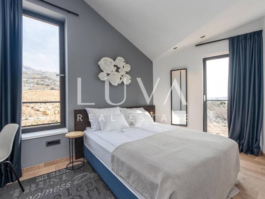 A luxury and unique house is for sale in the small, quiet village of Lukovo, near Karlobag. The house is modern and unusually shaped, located right by the sea. It is part of a complex of 3 identical houses used for tourist rental. Besides this house, the other two can also be purchased, presenting an excellent investment opportunity in tourism. The house has an area of 150 m² on a 400 m² plot and spans 3 floors. It features 4 bedrooms with en-suite bathrooms and a terrace with a pool and lounge chairs in front.